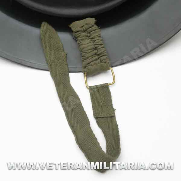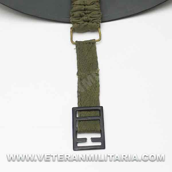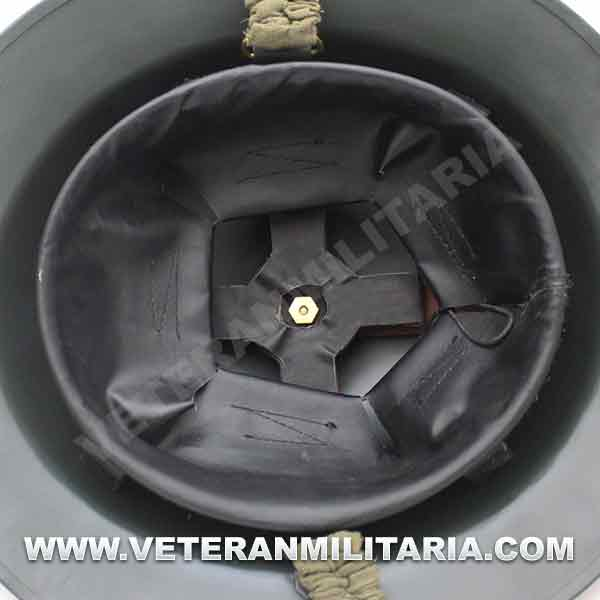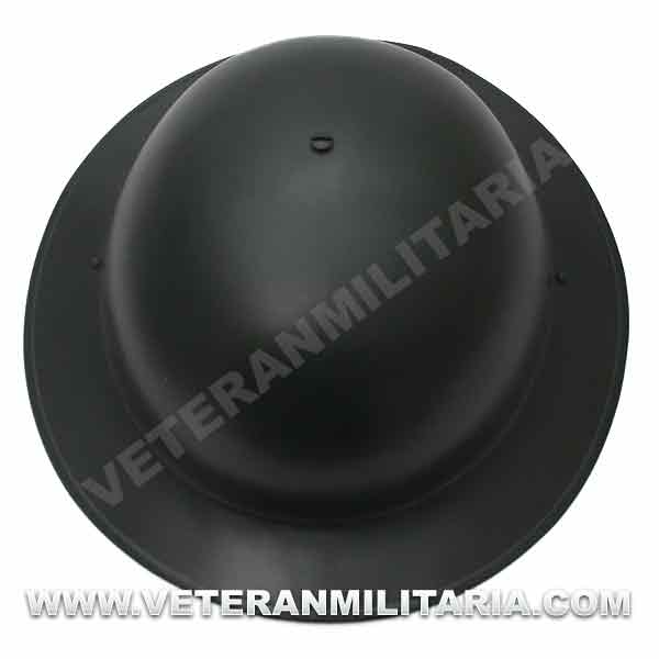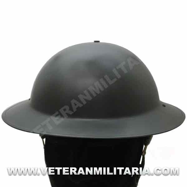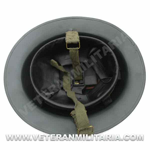 Reproduction of a British MKII helmet, made of steel, with a steel interior and chin strap.