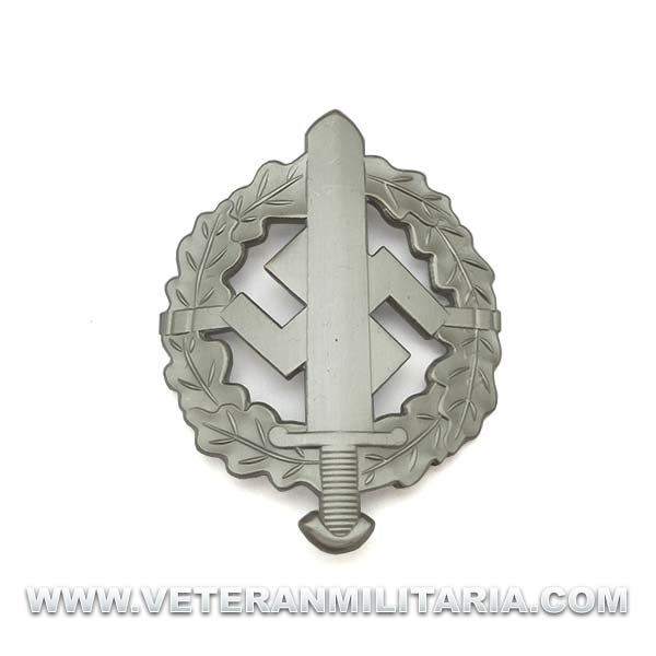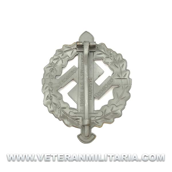 S.A. Sports Badge in silver. Copy of the 2nd version of the badge with the usual design depicting an upturned sword on a swastika surrounded by an oakleaf wreath. The reverse has an inscription in German which translates as ‘Property of the S.A. Sports badge main office’.