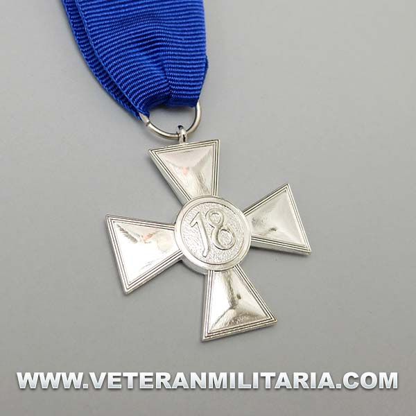 Reproduction Heer 18 Year Service Medal with Ribbon, made of silver metal with dark blue ribbon.