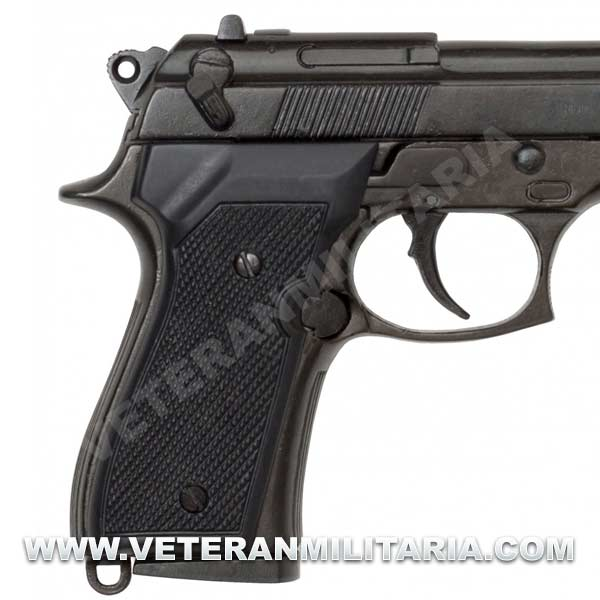 Reproduction of a pistol, made of metal and plastic grips, with simulated mechanism of charging and fire. The magazine and are removable.