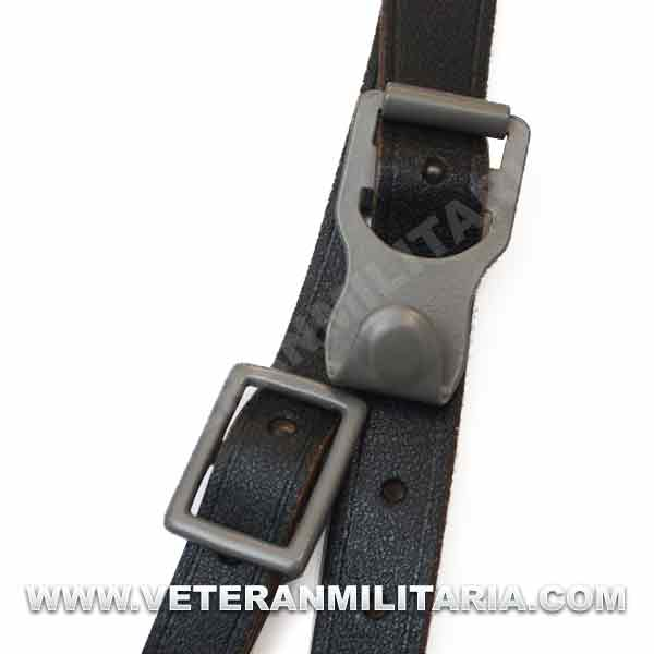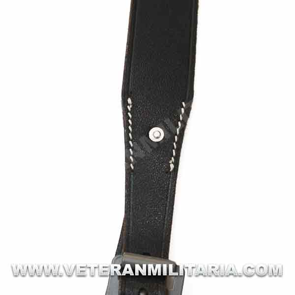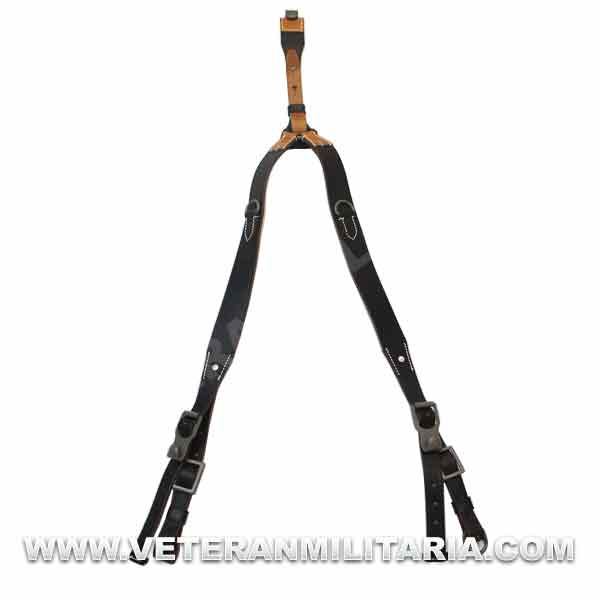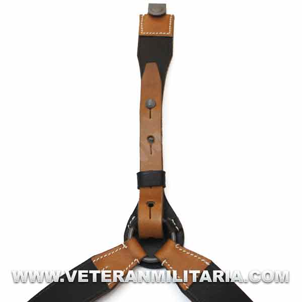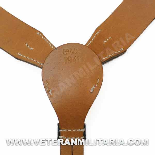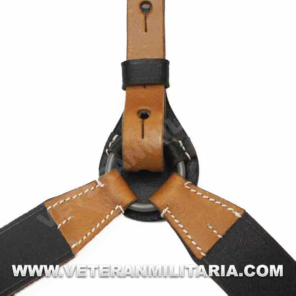 Reproduction of German combat leather Y-straps, made of natural leather, sewn with thread, all metal parts painted gray, manufacturer's markings.