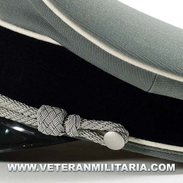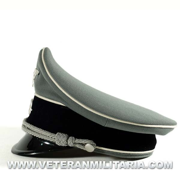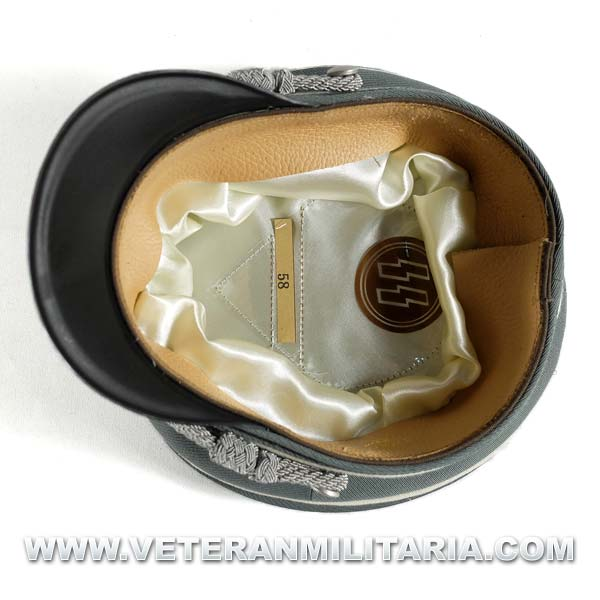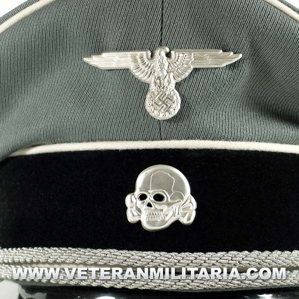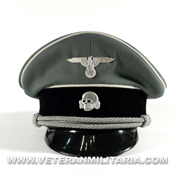 Waffen SS Officer Visor Cap, made of gabardine feldgrau color, black velvet band, trim white wool, satin lining, eagle insignia and the skull.