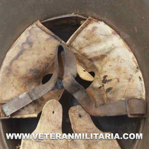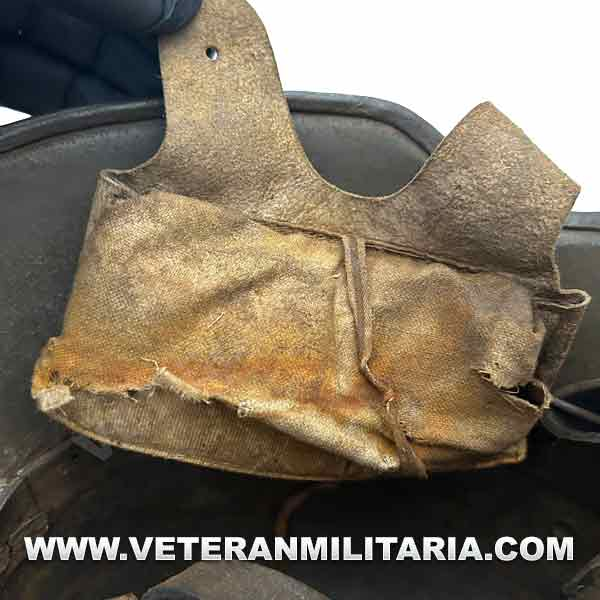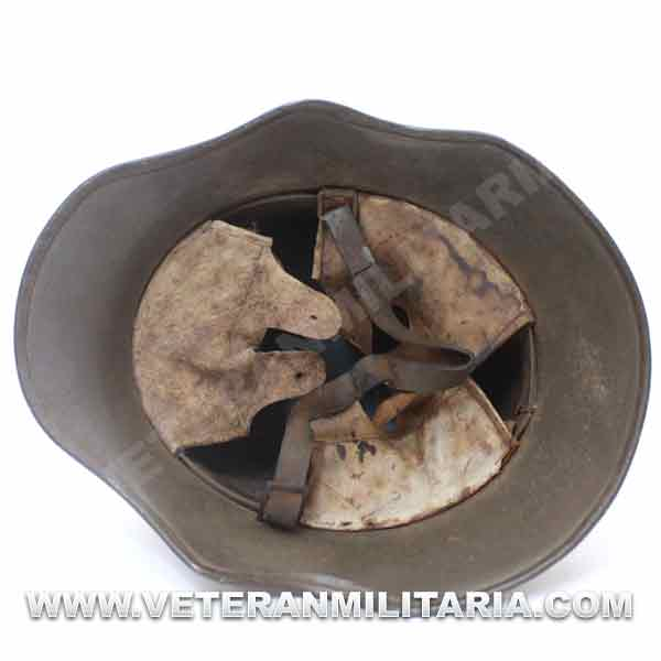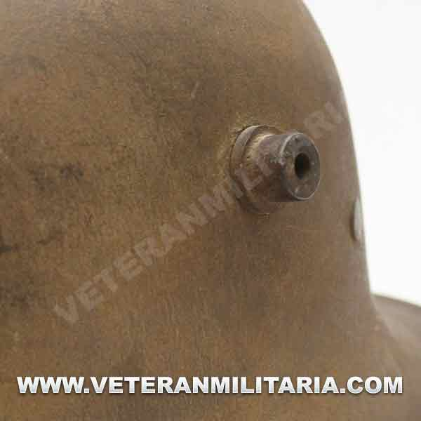German M18 model helmet with ear cutout, the helmet designation "Fernsprecherhelm" and introduced on an experimental basis in August 1918. The helmet has original paint (Wollstaub - wool powder), field grey, but over time tends to acquire a brown patina due to oxidation, ET64 markings on the inner section of the skirt, batch numbers are stamped on the top DB559R, complete interior, the fabric has small cracks, the chinstrap leather is a little dry.