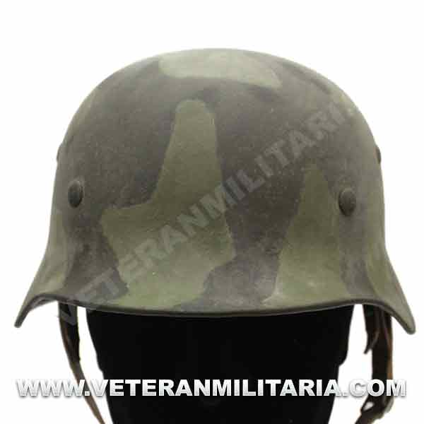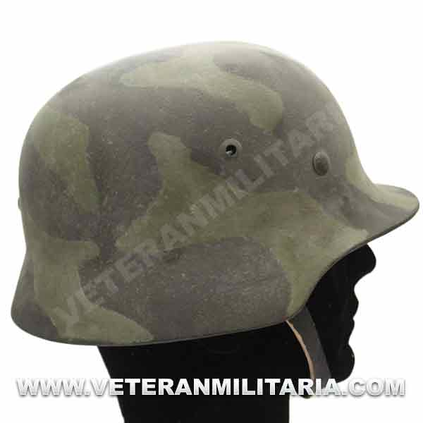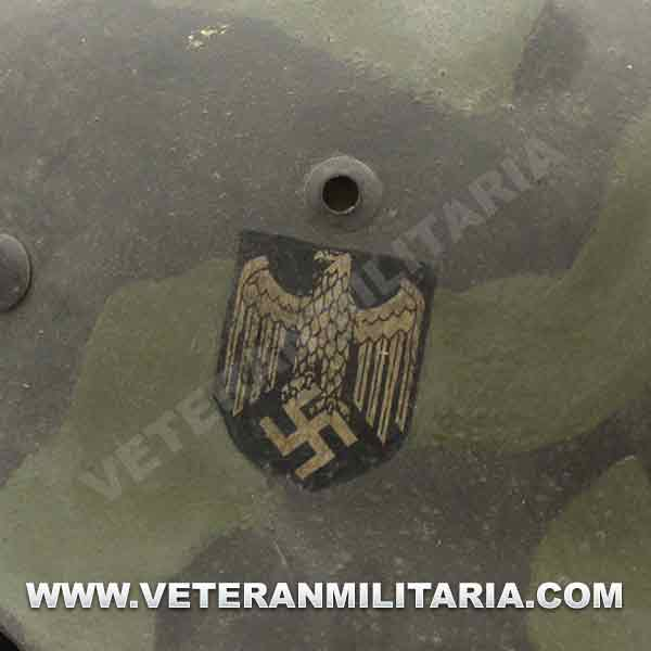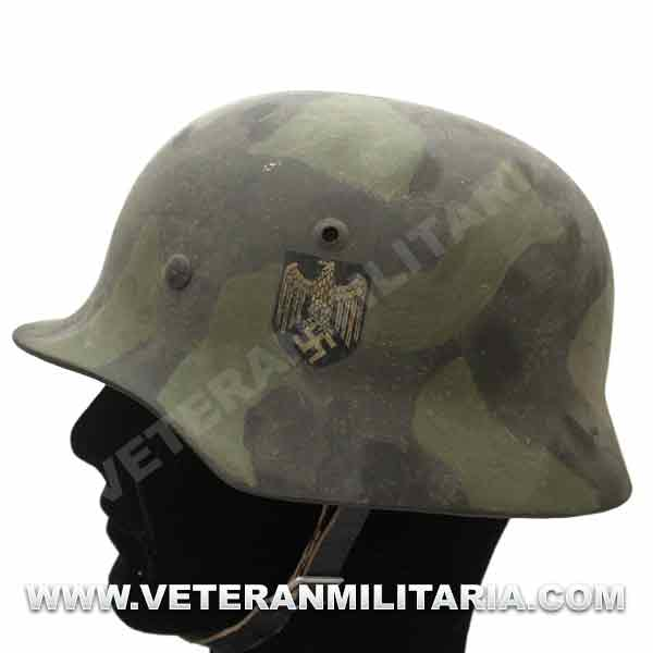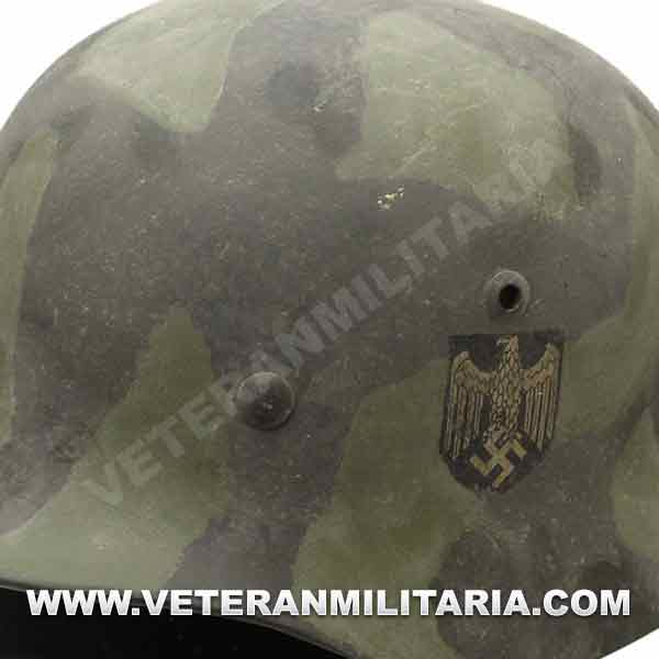 Reproduction of an M35 helmet, painted in camouflage, with a WH decal, made of steel, complete with interior and chin strap, manufacturer's markings.