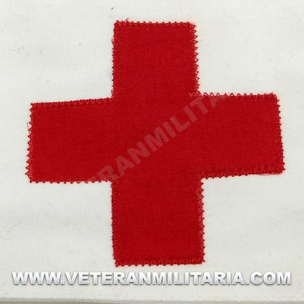 Armband of red cross sanitary ware, made of white cotton fabric in the center red cross stitched with red thread, in reverse stamp with numbers M 770207