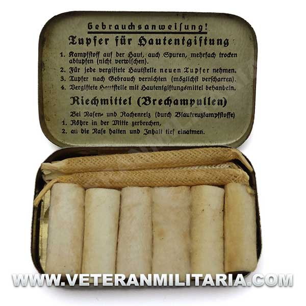Skin decontamination box serves to clean the skin after a gas or chemical attack. The box is metallic in the Tupfer für Hautentgiftung lid, inside there are 5 blisters and 6 cottons.