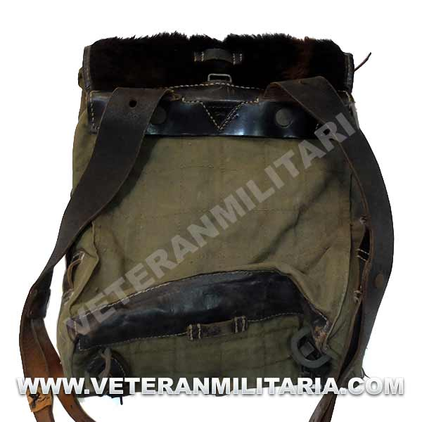 Original Tornister Campaign Backpack, covered with roof rack, is complete with all straps, 1943 markings, has a minor repair of one of the straps, includes three auxiliary straps and a strap with hook.