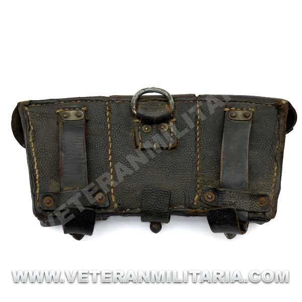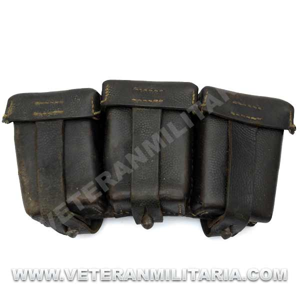 German K98 ammo pouch, made of grained brown leather with three compartments, probably repainted in black, markings on the back hoy 42