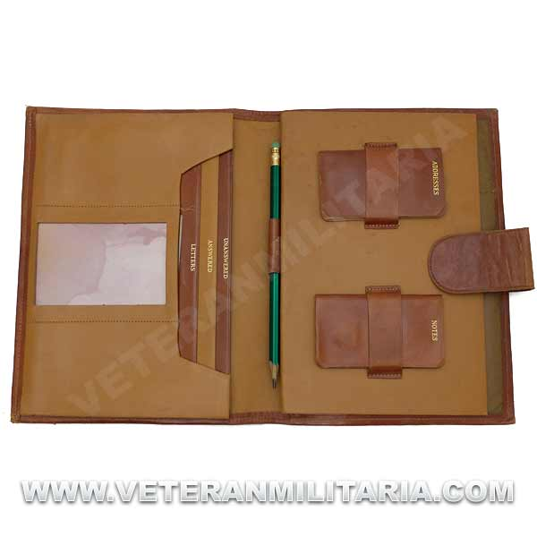 Correspondence portfolio (service buddy), made of leather, on the cover the name of soldier Stanley F. Adams, inside is 2 small notebooks, separator and pencil.