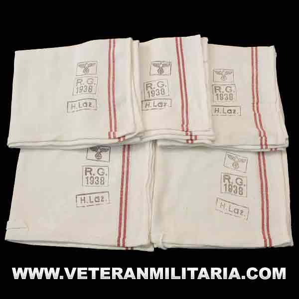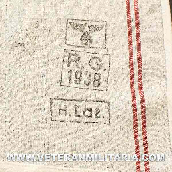 A reproduction of the German towel, made of cotton, this towel is marked on two corners with a Reich eagle and H. Laz, indicating ownership of an army hospital and the date 1938, Has a hanging loop.