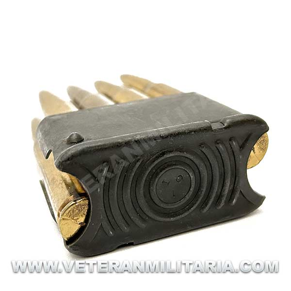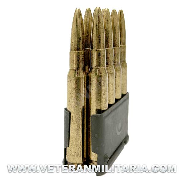 Ammunition clip for the M1 Garand. The clip is original and the bullets are metal reproductions by Denix.