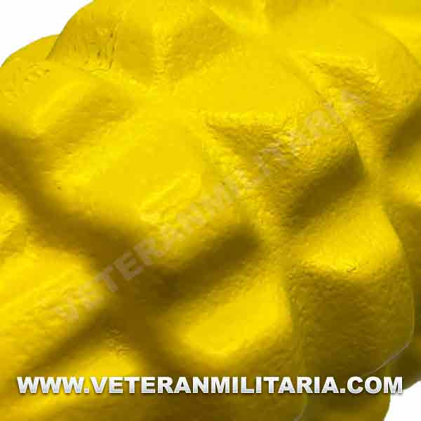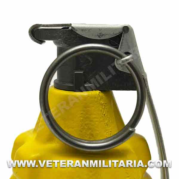 Reproduction of a World War II American MK2 grenade. The body is made of yellow resin. The safety lever (spoon) is made of metal, exactly like the originals. The pin and ring are made of metal, it is removable, the body is empty with the possibility of refilling.