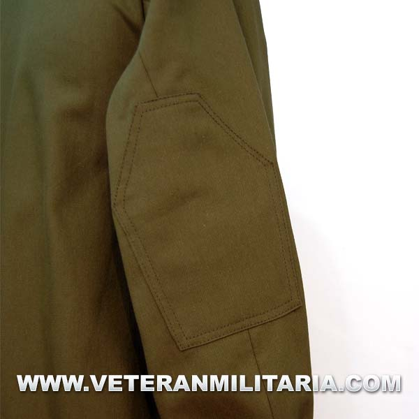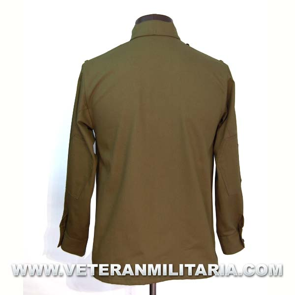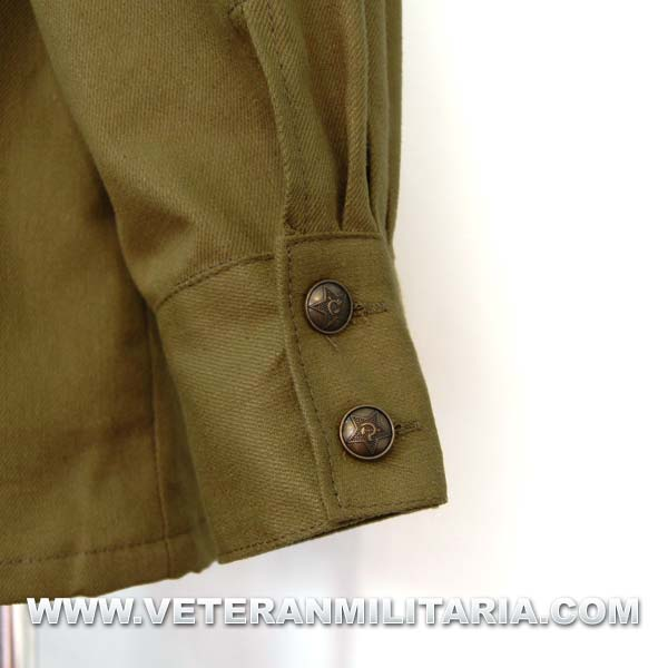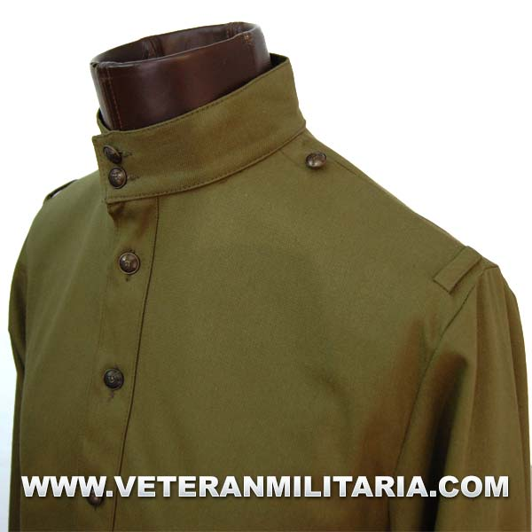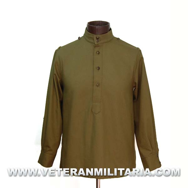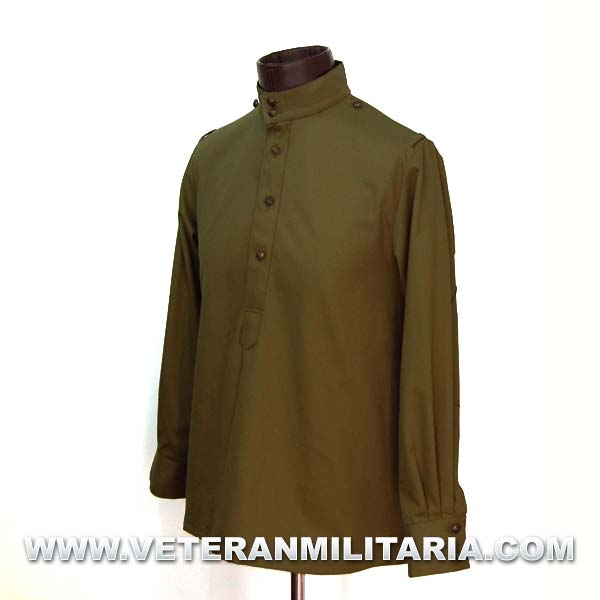 Gymnastiorka Russian model M43 for soldiers, made of cotton on the front end with five buttons, metal buttons, olive green.