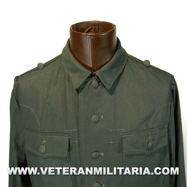 Drillichjacke of appropriations earmarked for soldiers and noncommissioned officers of the Wehrmacht and the Waffen SS, made in cotton moss green for the warmer seasons.