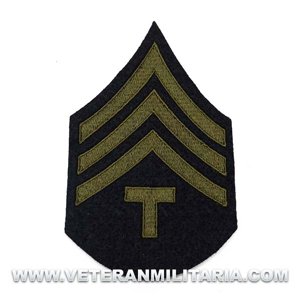 US Technician 4th Grade Chevron, haki-olive stripes on dark blue background.