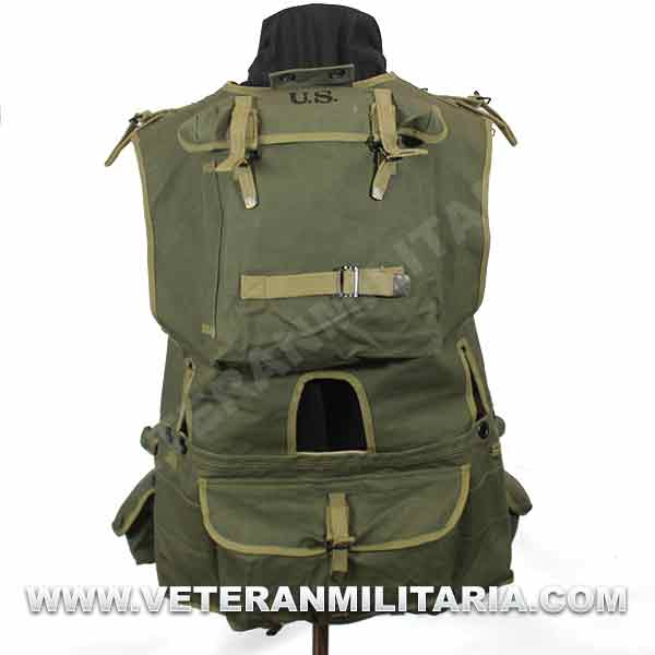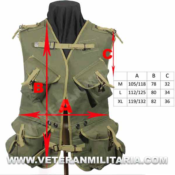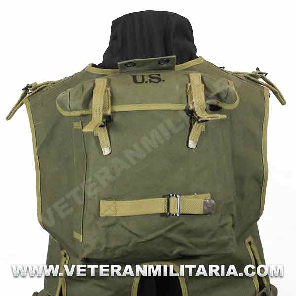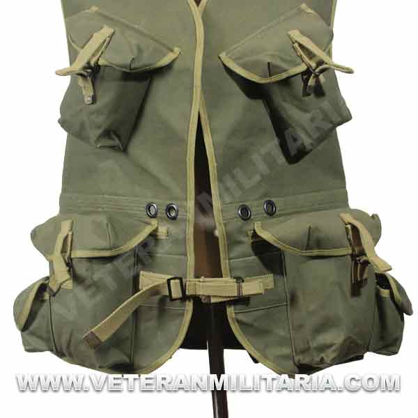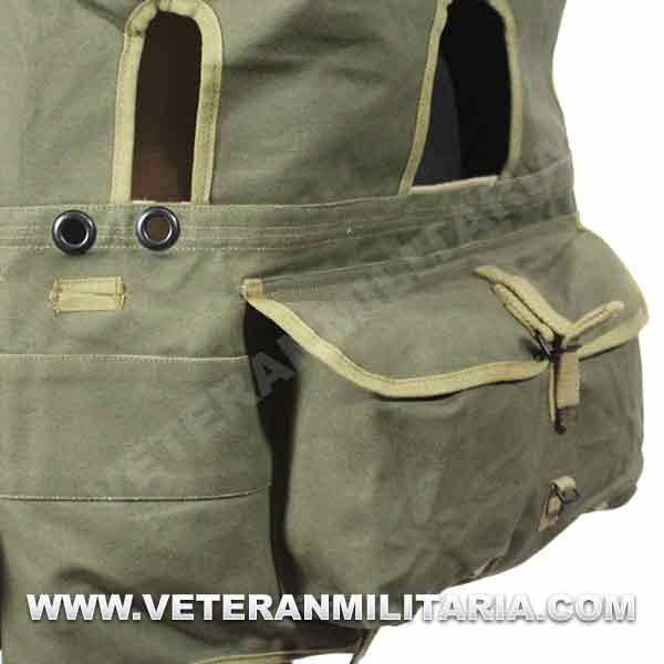 US assault vest made of olive drab cotton canvas with four large pockets on the front with quick-release straps and two smaller grenade pockets on the lower part. The grommets around the waist are designed to hold gear (pistol holster, tools, etc.). There is a trench tool loop on the upper back.