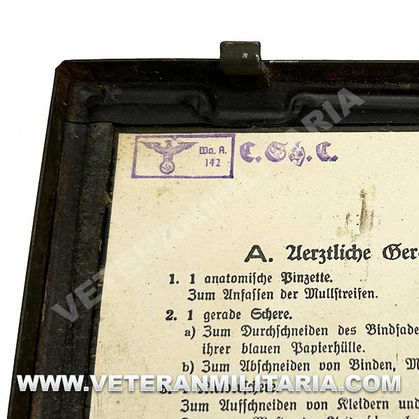 Complete “Verbandkasten” first aid kit. Metal box, the exterior retains most of its finish and the lettering along the front cover, inside paper label with information regarding the contents, dated 1939