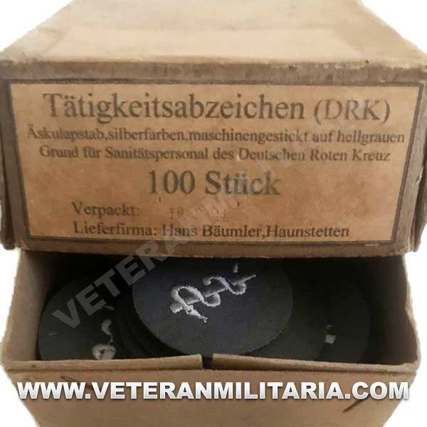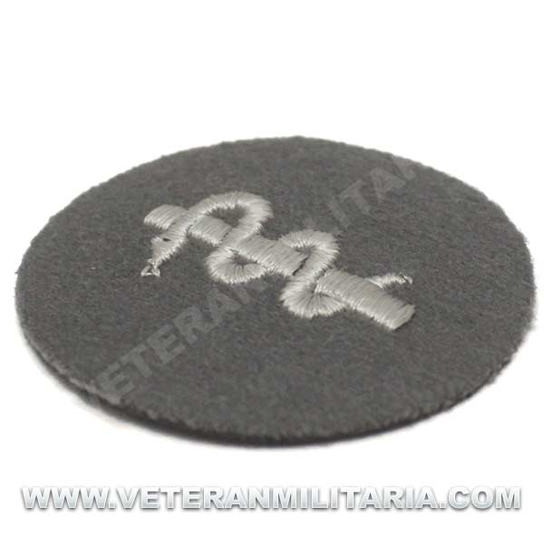 DRK patch, made with a gray background fabric and embroidered with white thread.