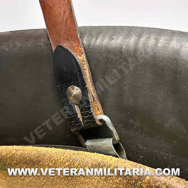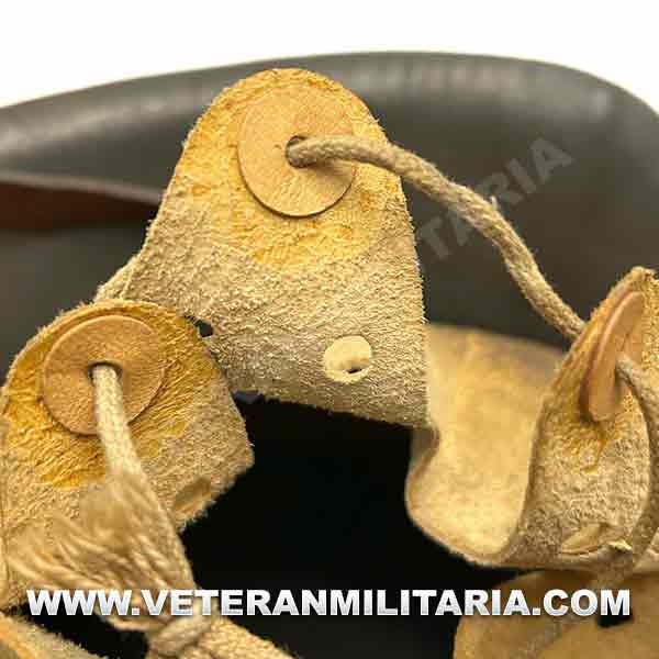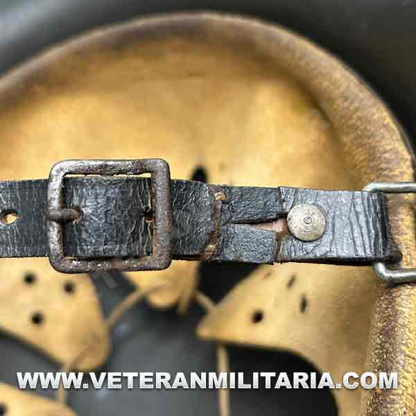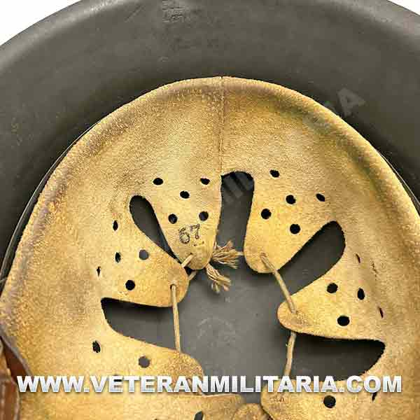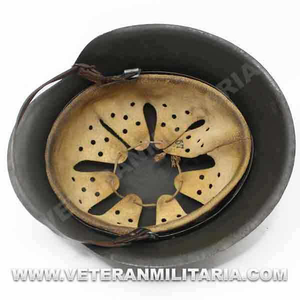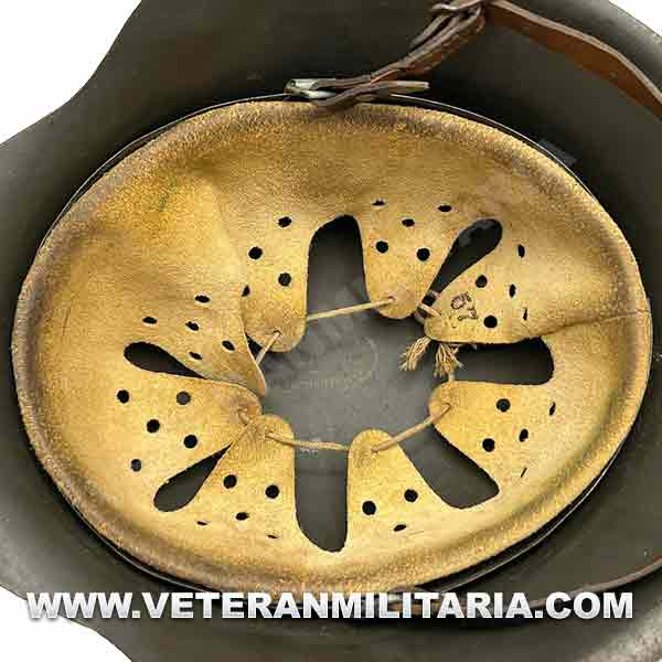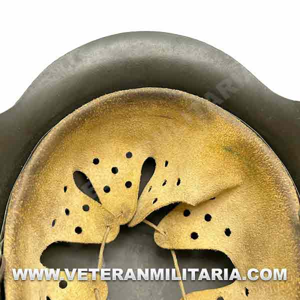 German M42 QVL64 helmet, serial number 5786. It retains its original paint, the interior is in perfect condition, the leather has markings, and the chin strap is marked 1944. The chinstrap leather is slightly dry.