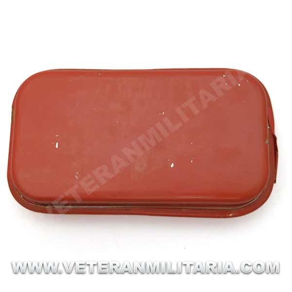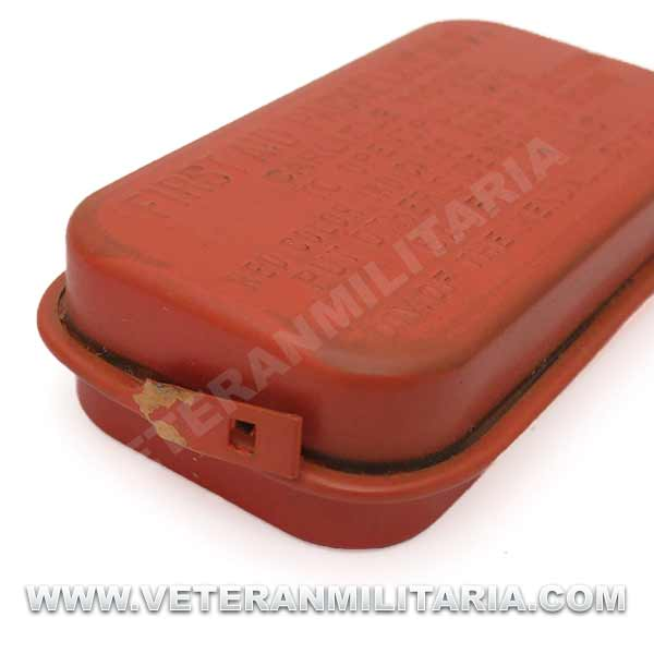 Original first aid kit from the Second World War, Carlisle model manufactured by Bauer & Black in red. They are still unused, sealed. It opens like a can of preserves. Contains bandages. Size 10 x 5 x 2.5 cm. All packages show different signs of use and aging, and small dents, and are not the same as the photograph.