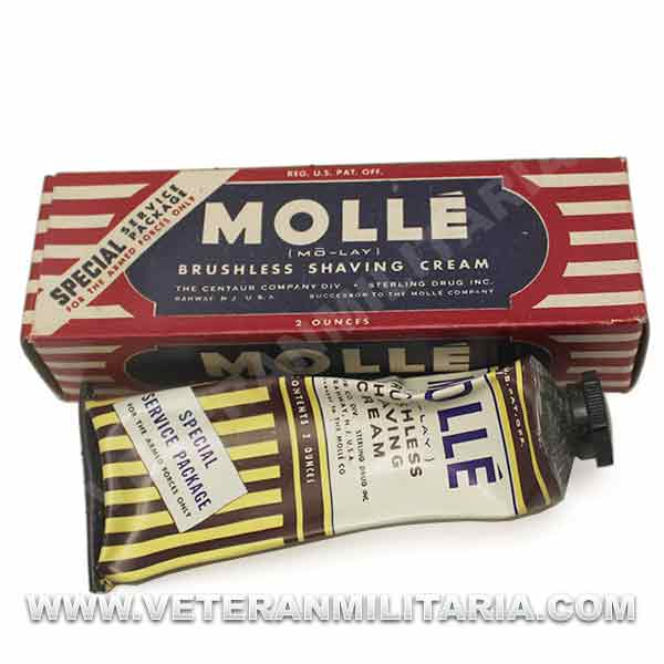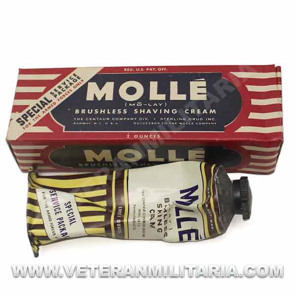 Original Molle shaving cream, cream tube with cardboard box. These Molle Shaving Cream boxes were packaged and specifically marked for the Armed Forces.