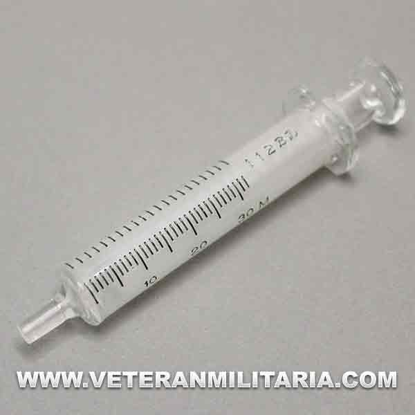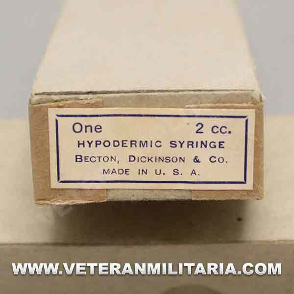Original U.S. glass syringe in a box, with measurements from 0 to 30 mm on the side. Cardboard box labeled "Becton, Dickinson & Co." The syringe is 2 cc.