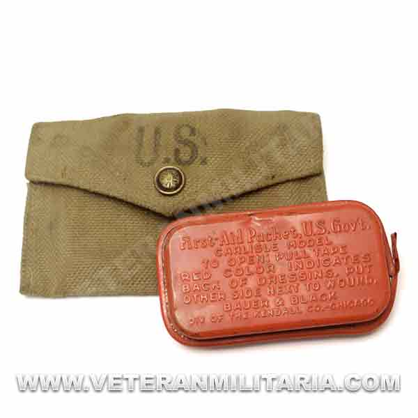 First aid bag British made with first aid kit orange, on reverse manufacturer's markings U.S A.C. and date 1944.
