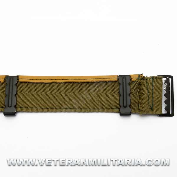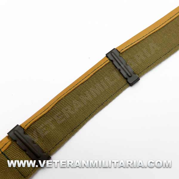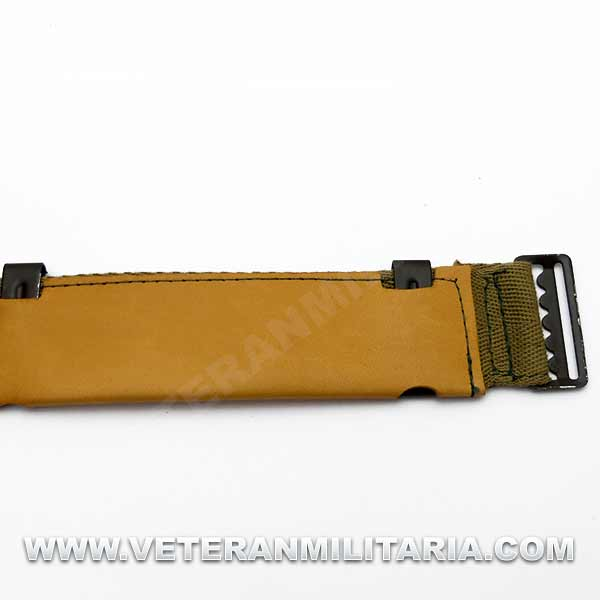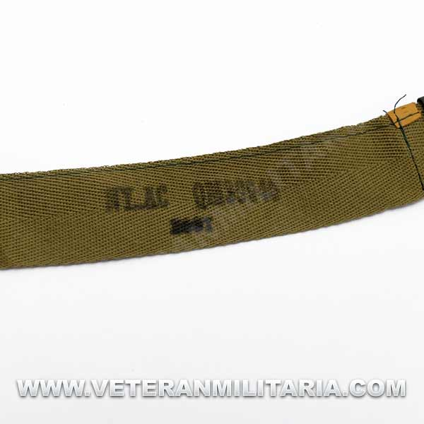 Reproducción de cinta ajustable con sudadera de cuero con hebilla versión 1943, incluye 6 pinzas, lona de color OD#3, este tipo de cinta se montaban en coscos M1 dese 1943 a 1945
