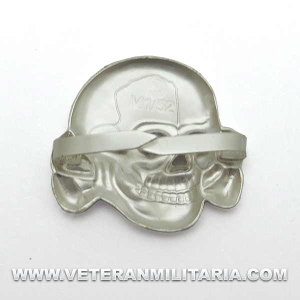 Reproducción de la calavera SS para gorras de plato, fabricada en metal color plata mate, en reverso marcajes del fabricante RZM.