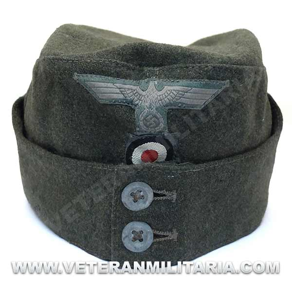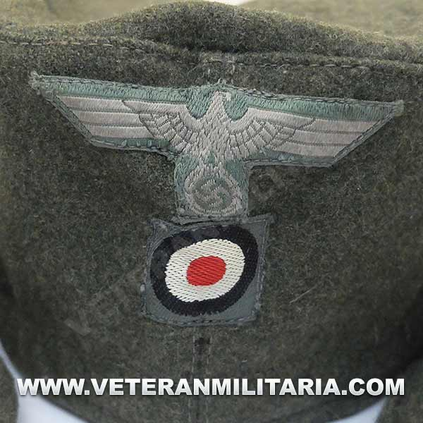 Gorra alemana Feldmütze M42 de la Wehrmacht original, aquila y la cucarda en buenas condiciones, la ventilación de la parte izquierda presenta pequeña reparación y en el interior el forro también tiene pequeño recosido. Estampado en su interior demasiado desgastado para poder identificar. Talla 58
