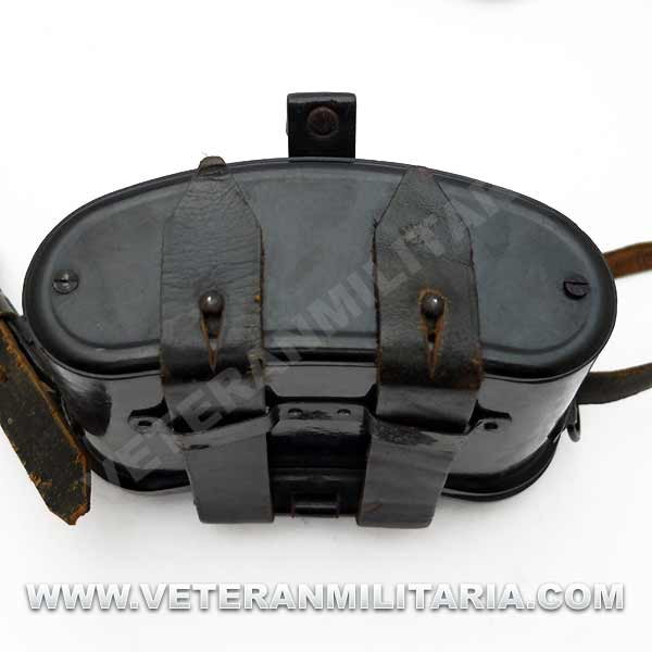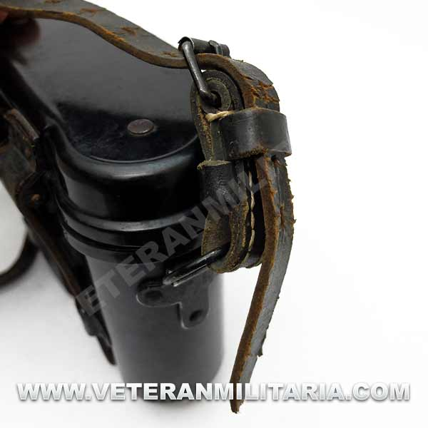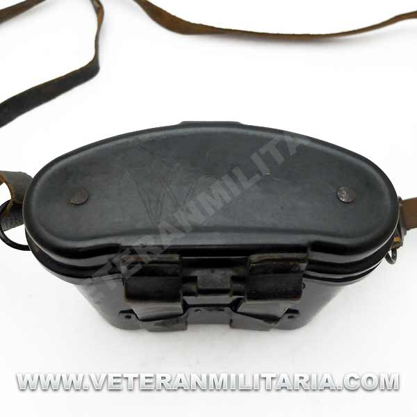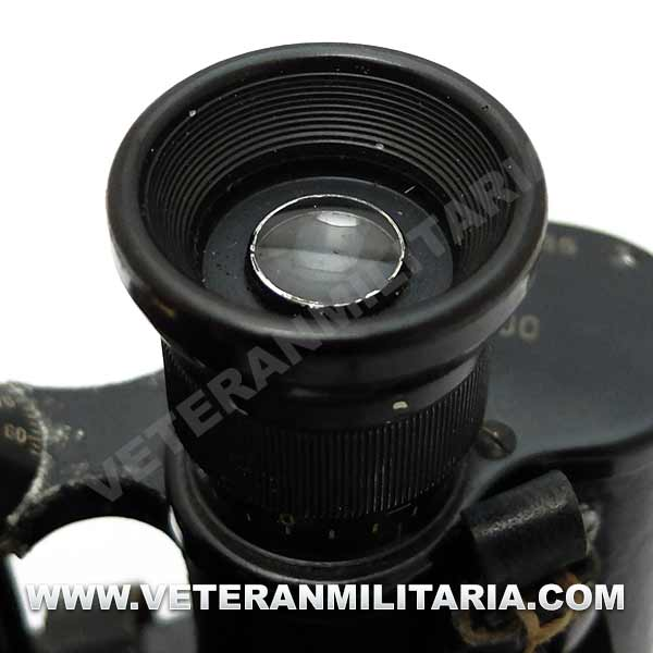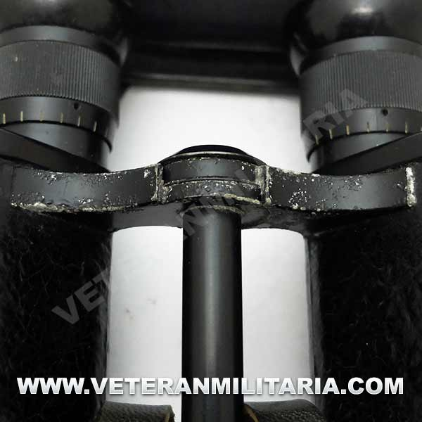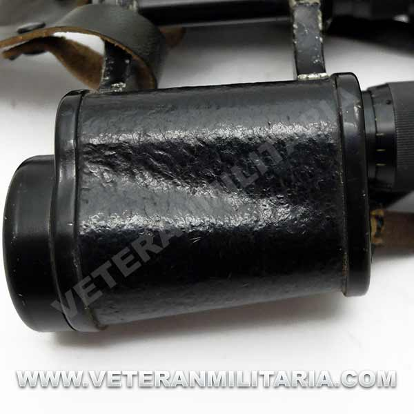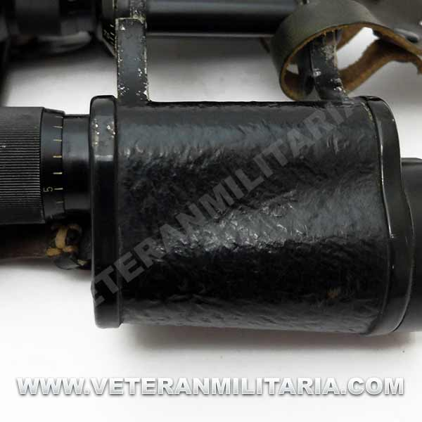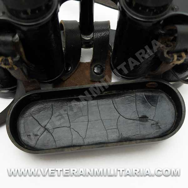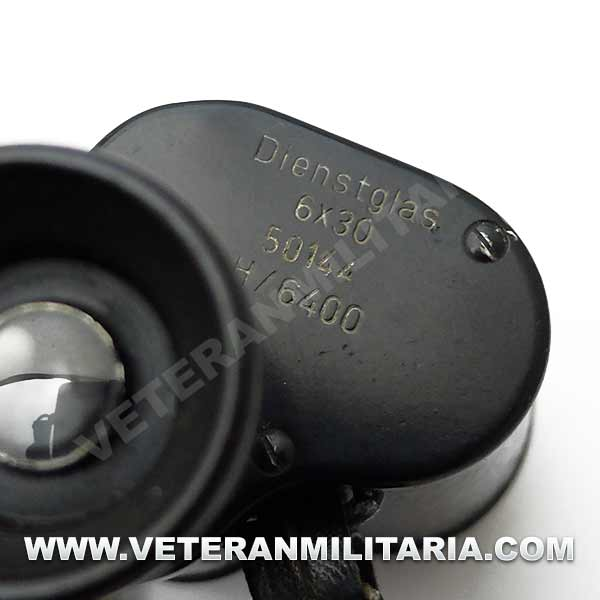 Prismáticos alemanes de campaña 6x30 con funda de baquelita, el cuerpo esta hecho de aleación de aluminio pintado de color negro, en la placa derecha está grabado DIENSTGLAS, aumento 6c30, número de serie 50144 y H/6400, tapa de oculares de baquelita, lengüeta de cuero negro, correa de cuero. Las ópticas en perfectas condiciones el ocular derecho tiene la retícula, la funda es de baquelita marcada Frn41 (Rudolf Lang, Brandeburgo), en el interior marcajes de fabricante, marcado con Waffenamt, correa de cuero.