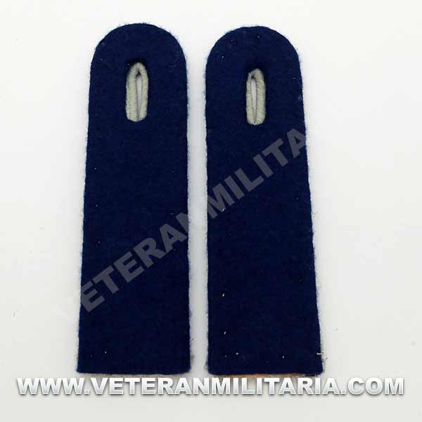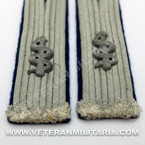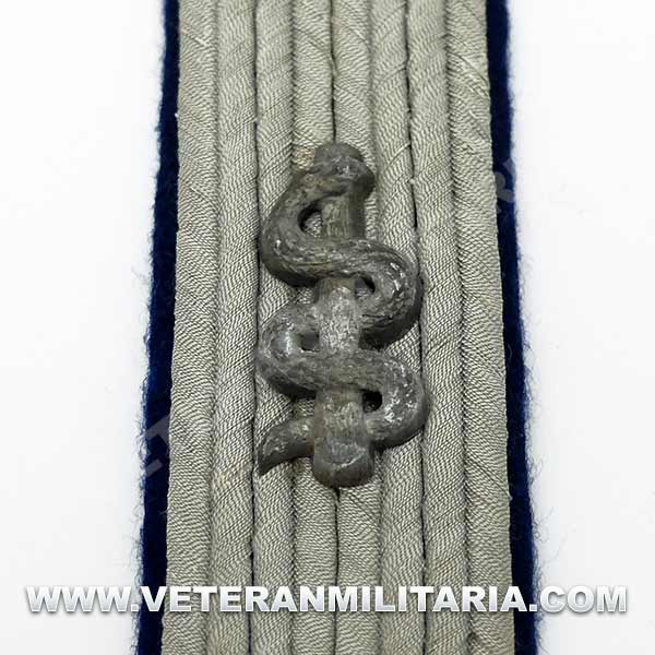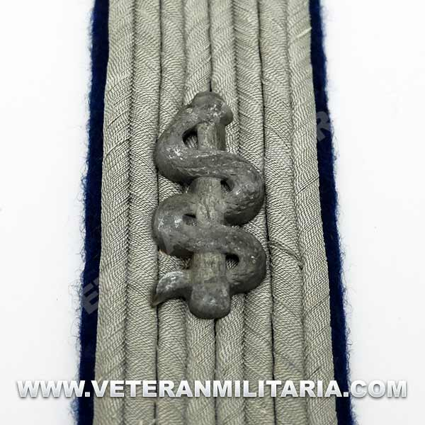 Hombreras de oficial médico de la Wehrmacht con rango de teniente, trenza de aluminio mate, sobre un fondo de color azul oscuro, insignia en zinc gris.