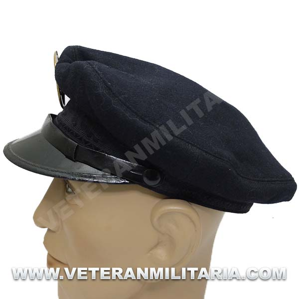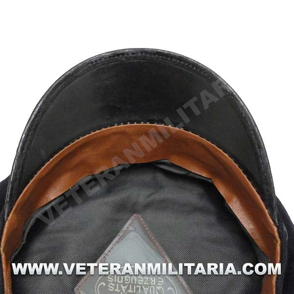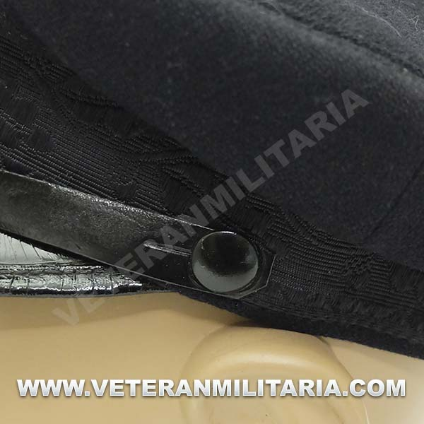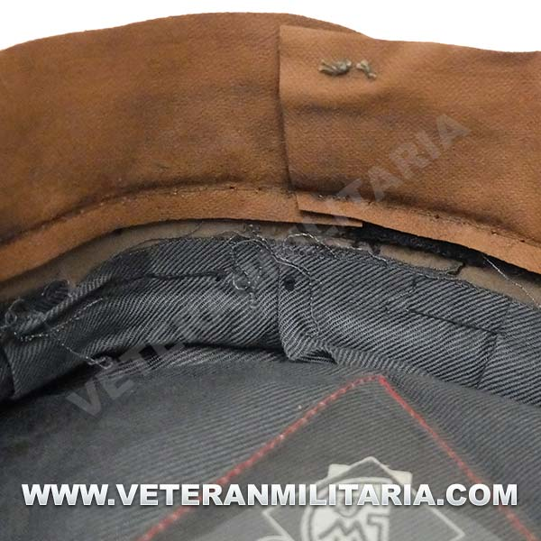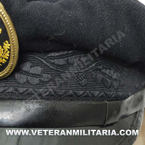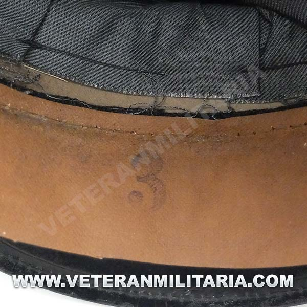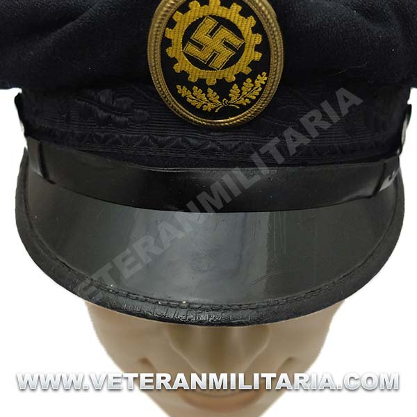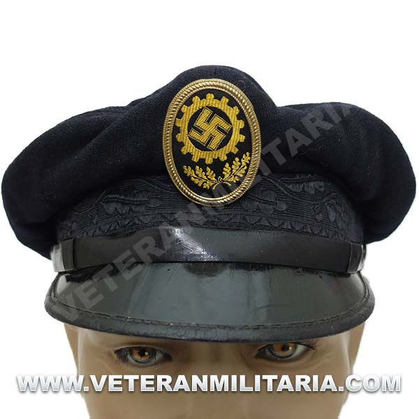 Gorra de plato de DAF (Frente Alemán del Trabajo), confeccionada con lana gruesa de color azul oscuro, en el exterior lleva una banda de sarga de algodón negra con hojas de roble y bellotas, insignia de DAF con marcajes RZM, en el interior etiqueta de fabricante QUALITATS ERZEUGNIS. Talla pequeña