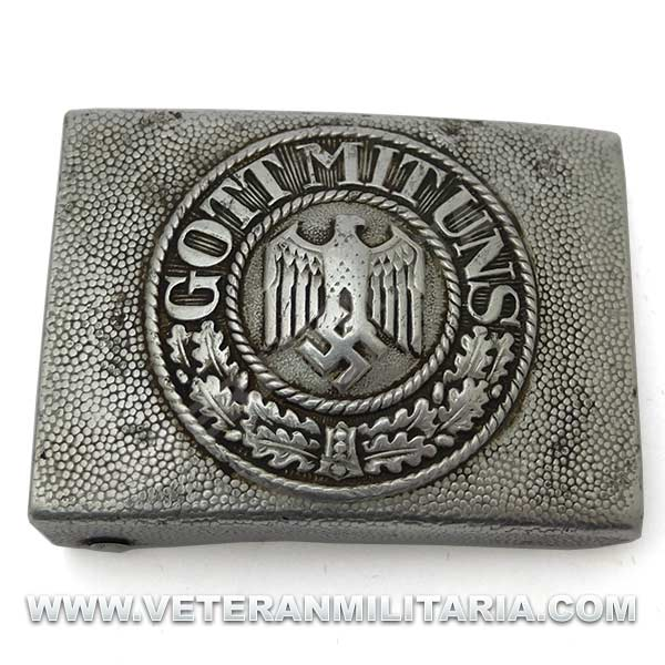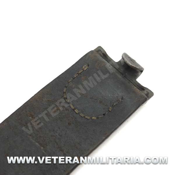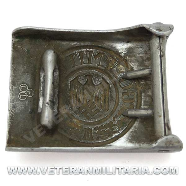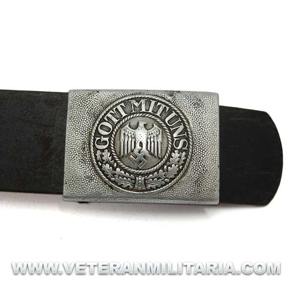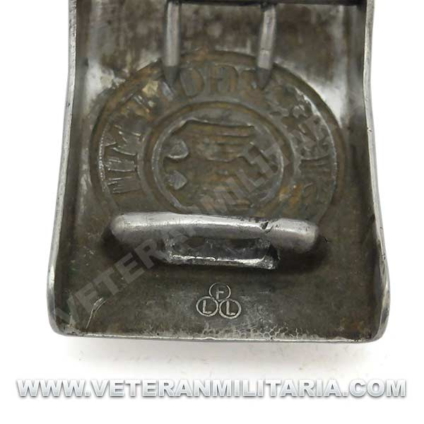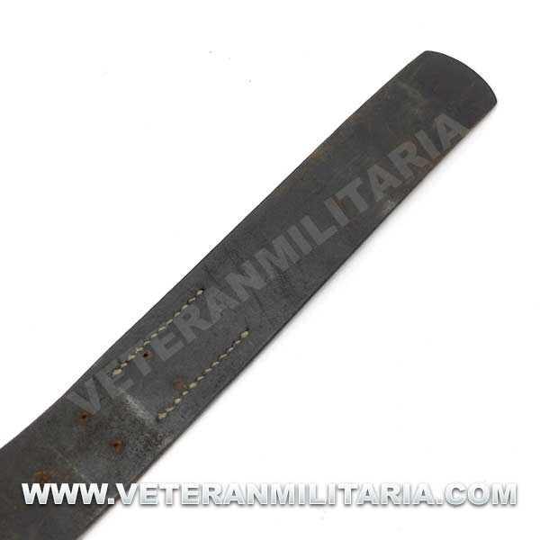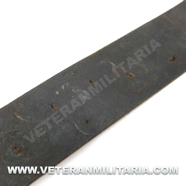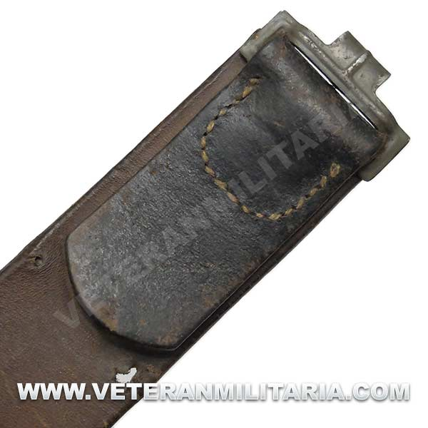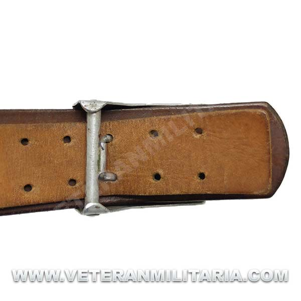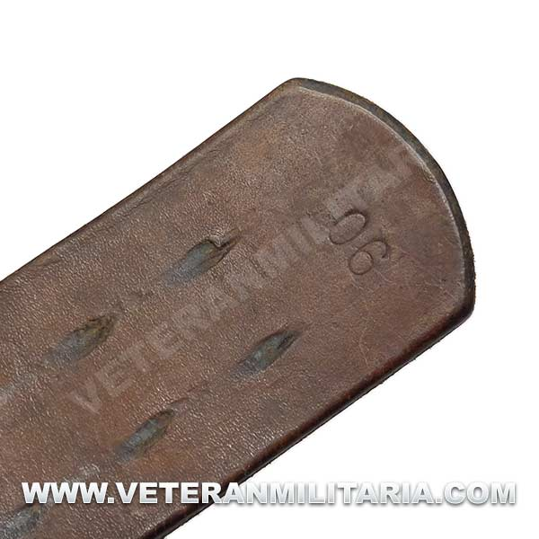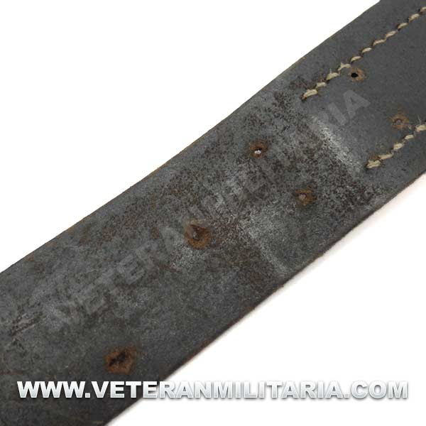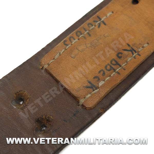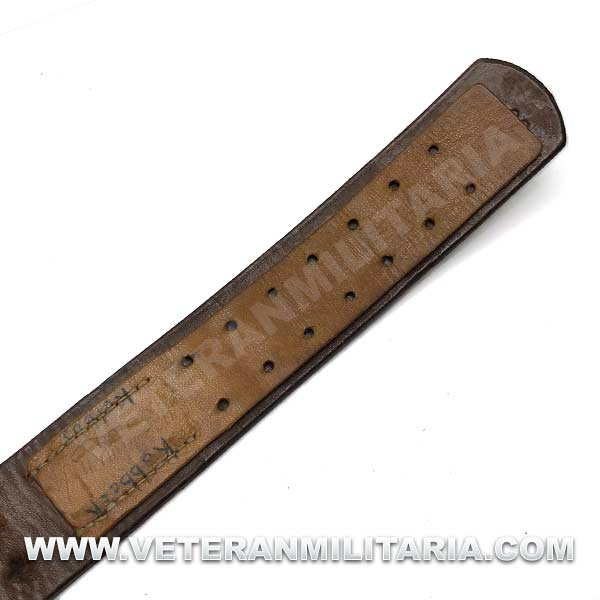 Cinturón de combate con hebilla del Heer original, hebilla de aluminio en reverso marcajes del fabricante FLL (Friedrich Linden Lüdenscheid). El cinturón conserva su elasticidad, tiene estampada la talla 90, cinturón tiene muchos pequeños agujeros probablemente fue utilizado como el cinturón del odio (Hate Belt)