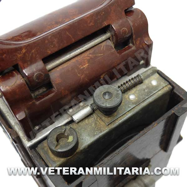 Farol de carburo alemán realizado totalmente en baquelita, solo dispone de una chapa metálica para la ventana, tiene dos depósitos, marcajes del fabricante, en el gancho trasero Waffenamt, gran gancho para colgar el faro.
