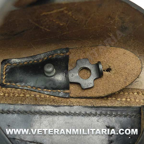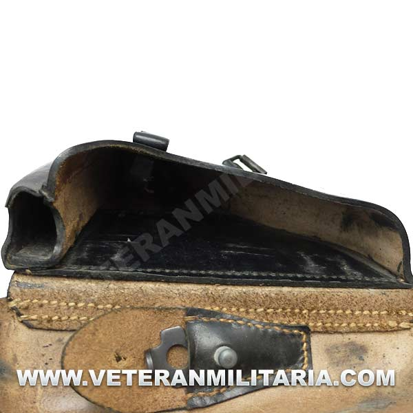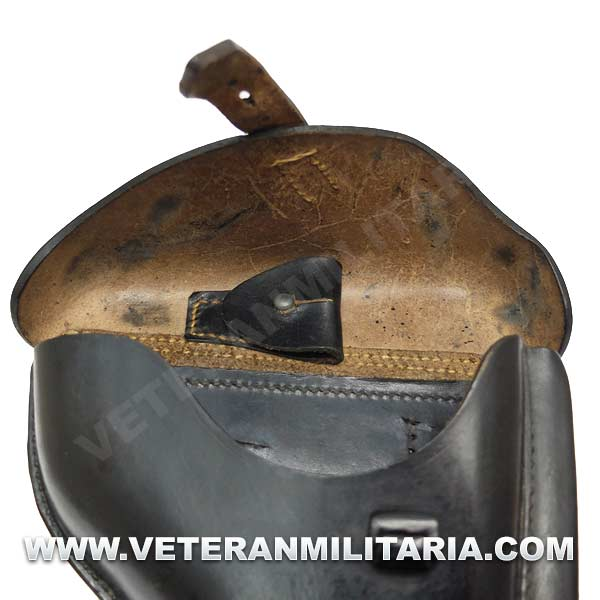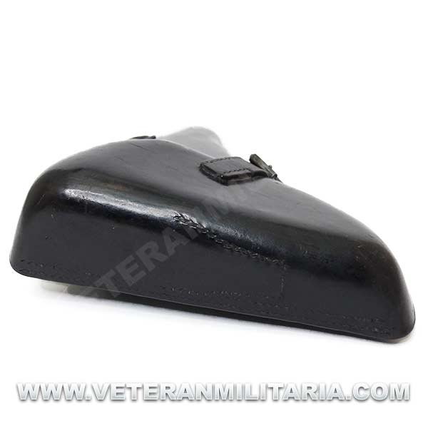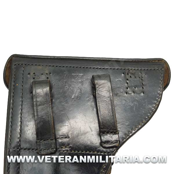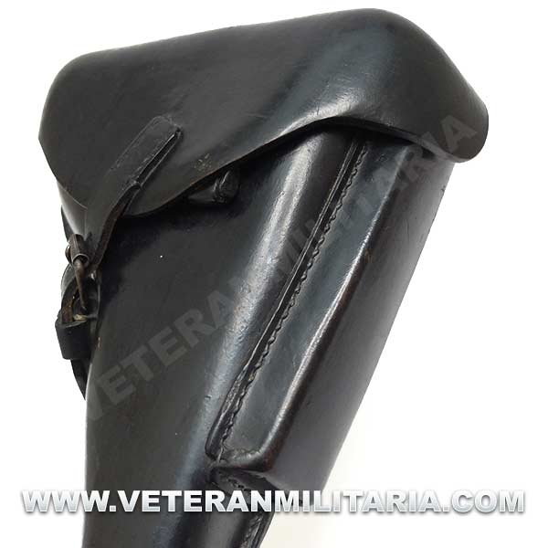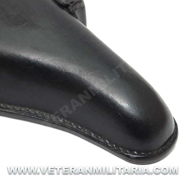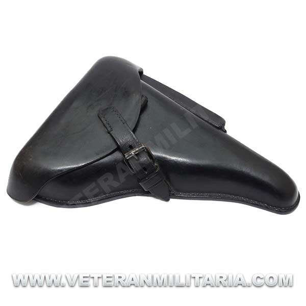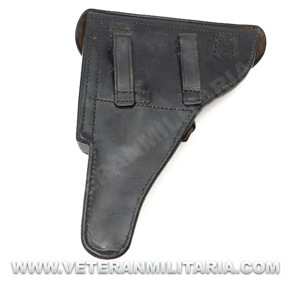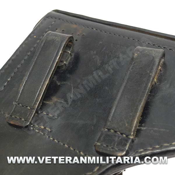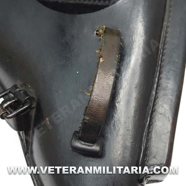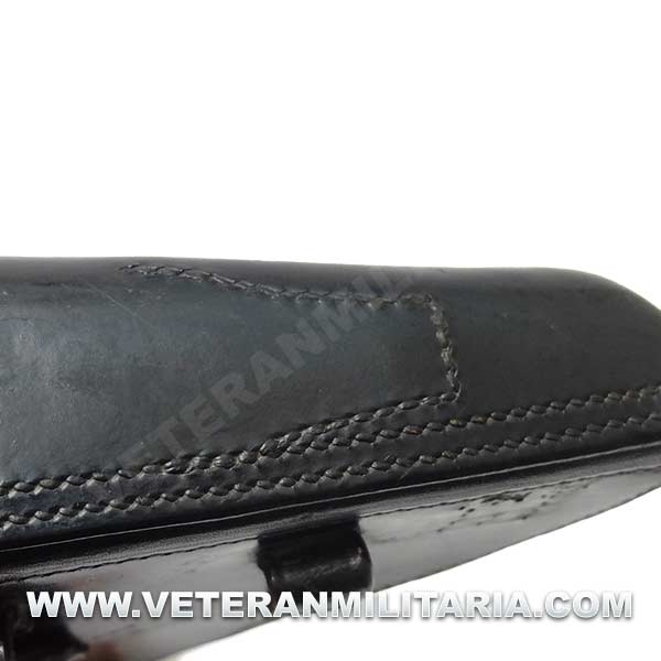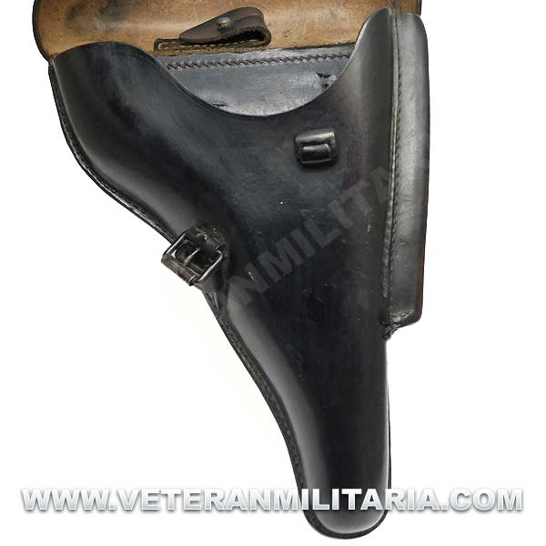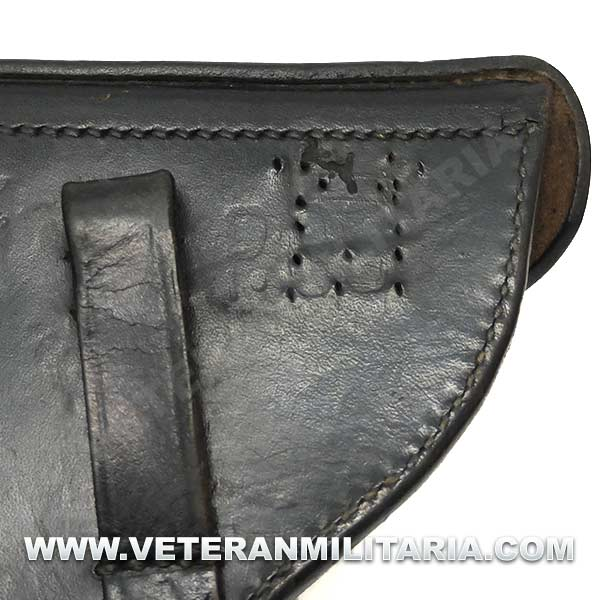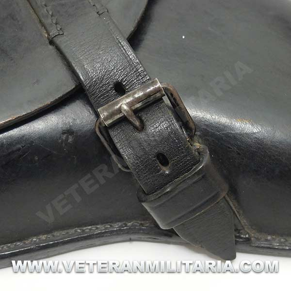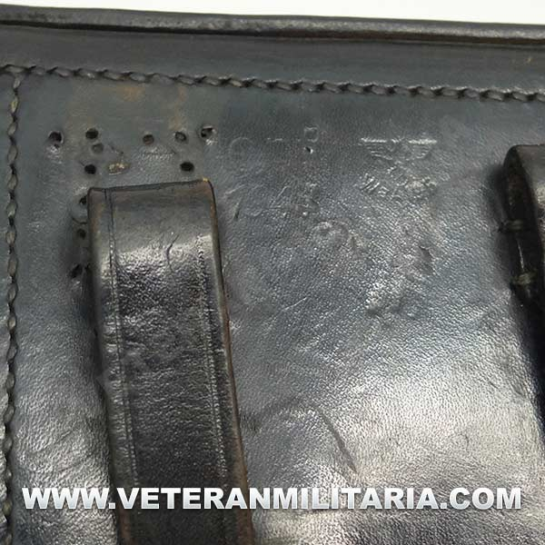 Funda para la pistola Luger P08, fabricada en cuero de color negro en perfectas condiciones, las correas y trabillas en perfecto estado, en el reverso marcajes «epf 1941» y el sello Waffenamt, todas las costuras y el cuero en excelentes condiciones,interior completo con bolsa para herramientas con la llave. En el reverso se aprecia haber tenido cosido trabillas.