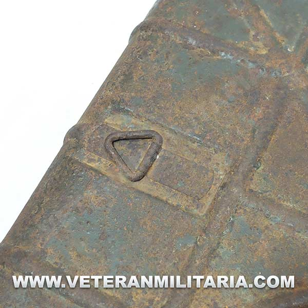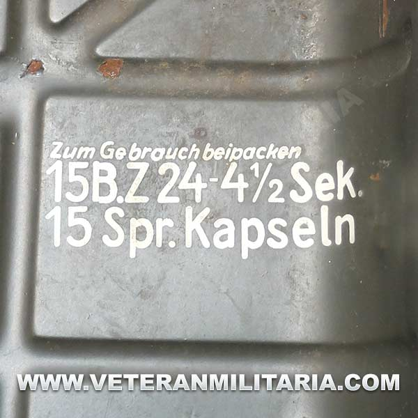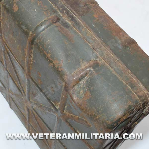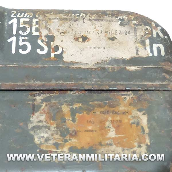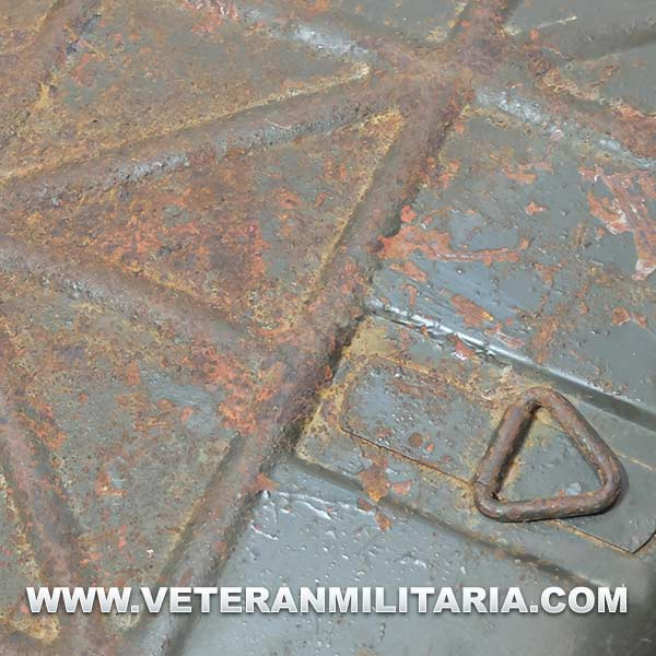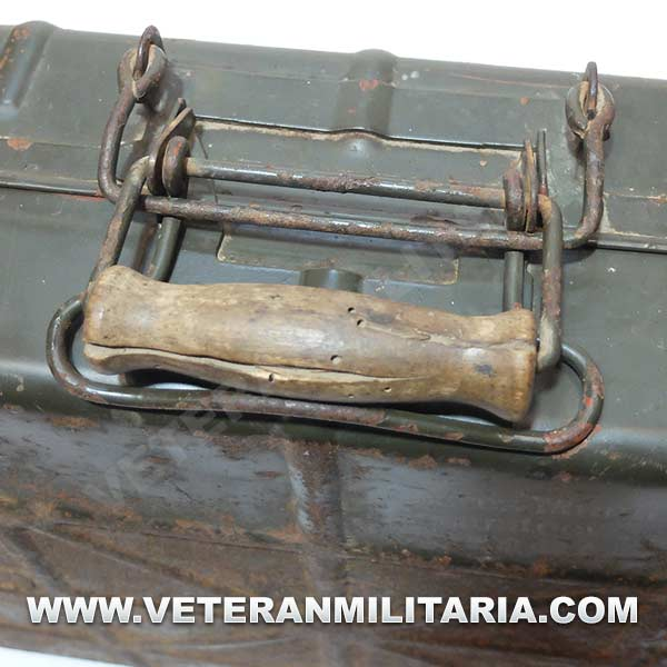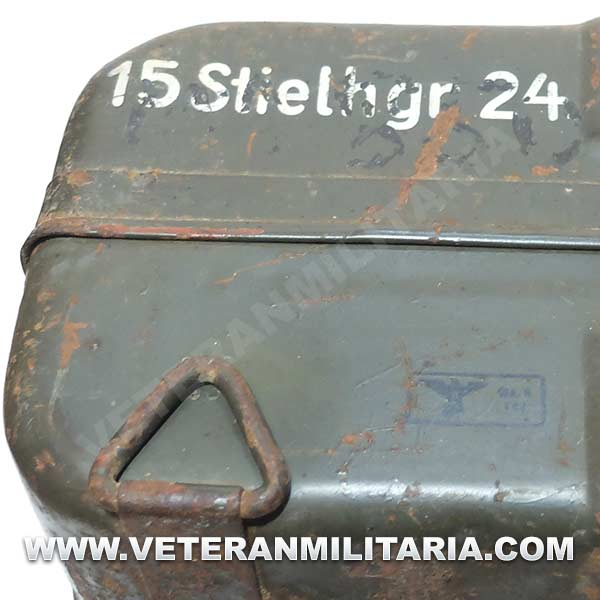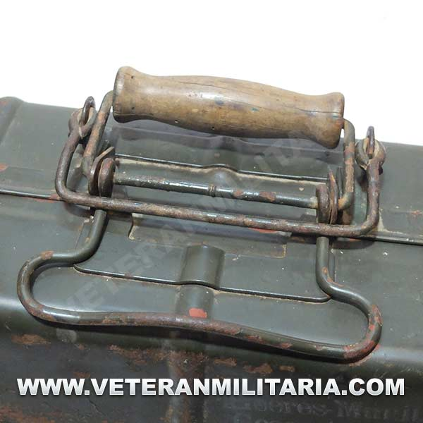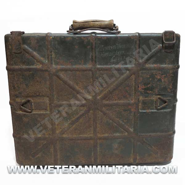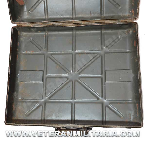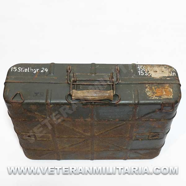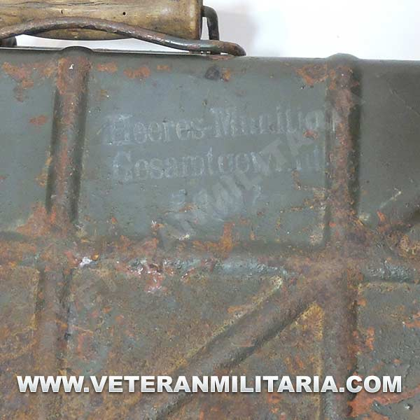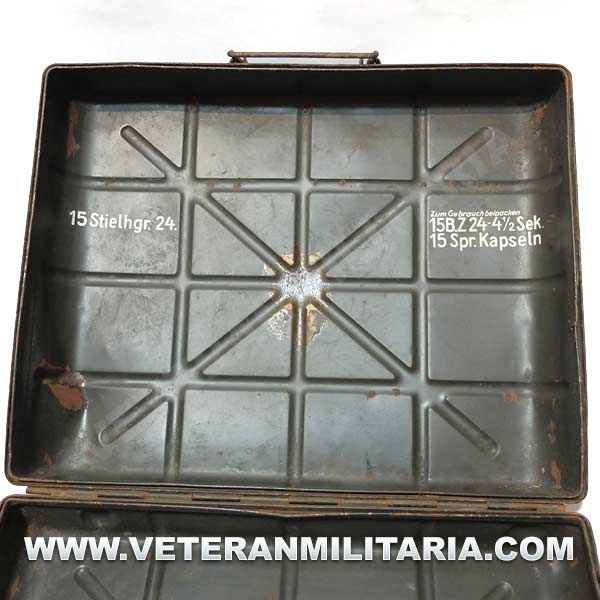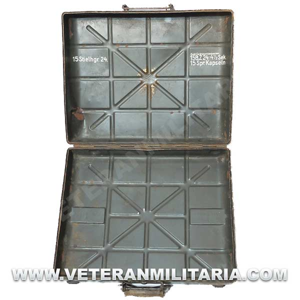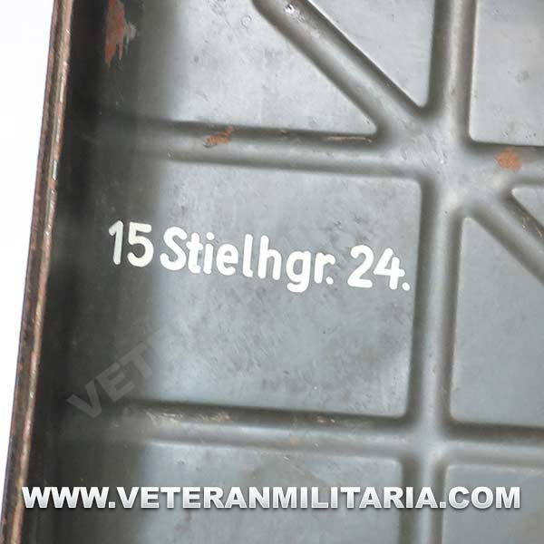 Caja o maleta alemana para transportar granadas M24, fabricada en chapa de acero, marcajes 963 1939, sello Waffenamt, interior con marcajes, en el centro por los dos lados tiene manchas de oxido.
