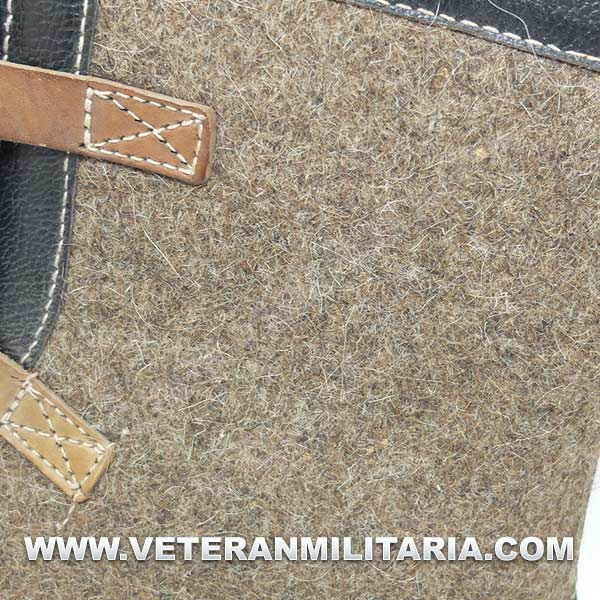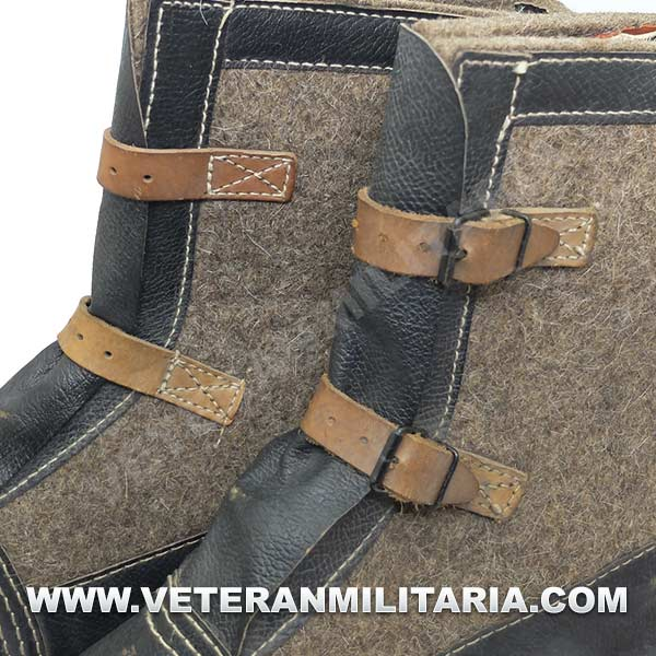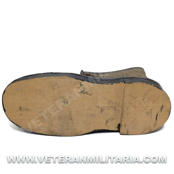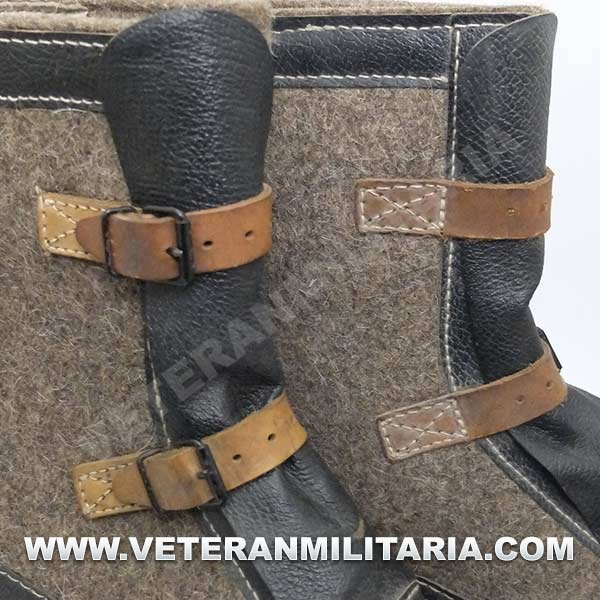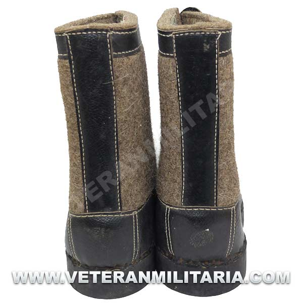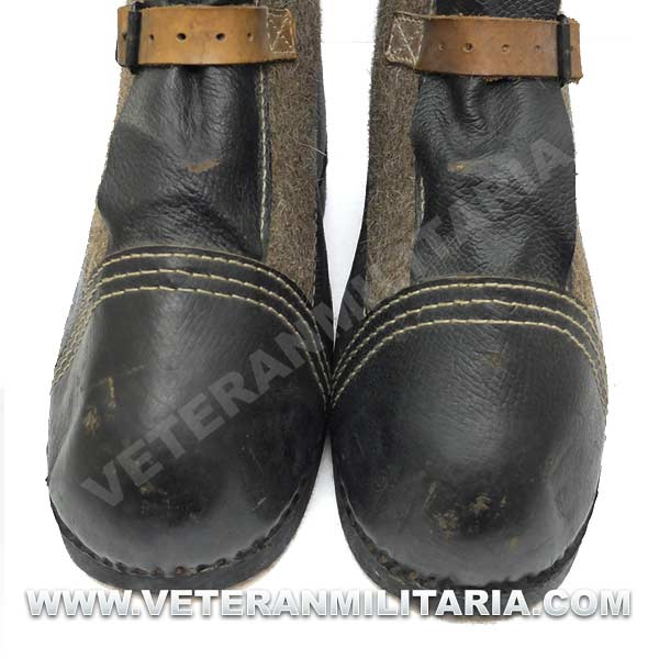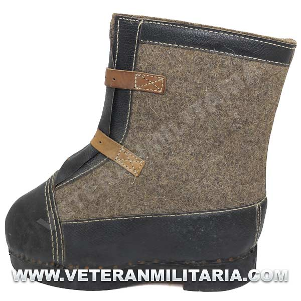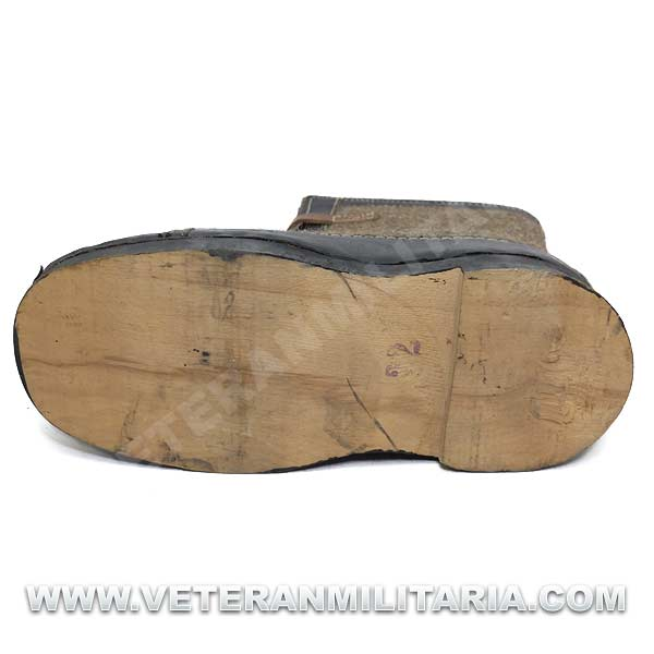 Botas de invierno (sobrebotas de fieltro), fabricadas en fieltro cuero y madera, en el interior etiqueta de fabricante y fecha 1943. Su uso estaba destinado principalmente a centinelas. Las botas nunca fueron usadas, estado nuevo