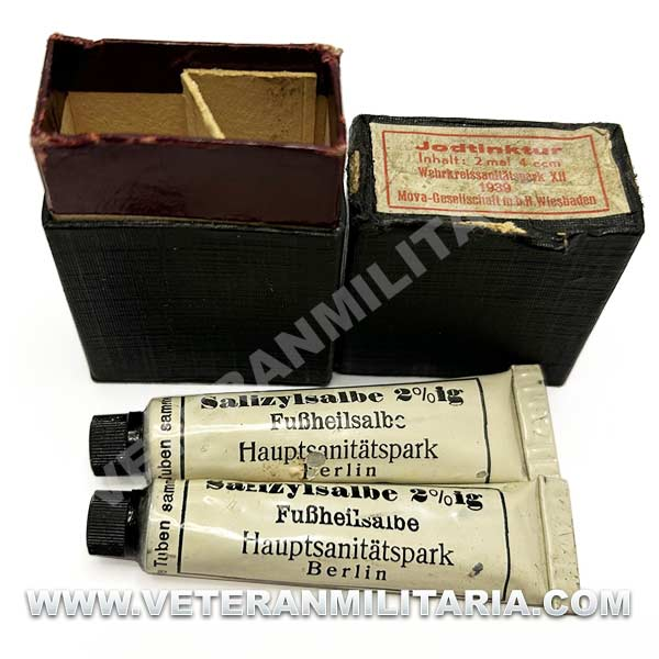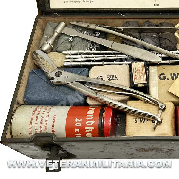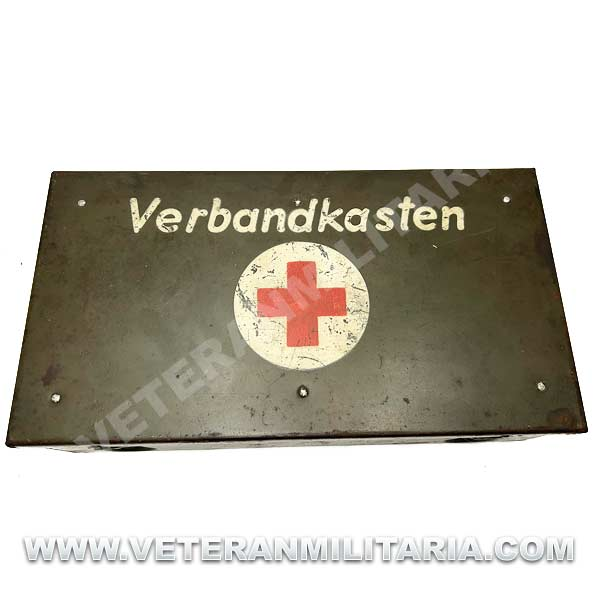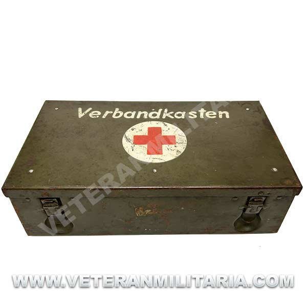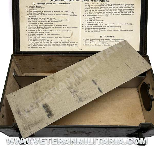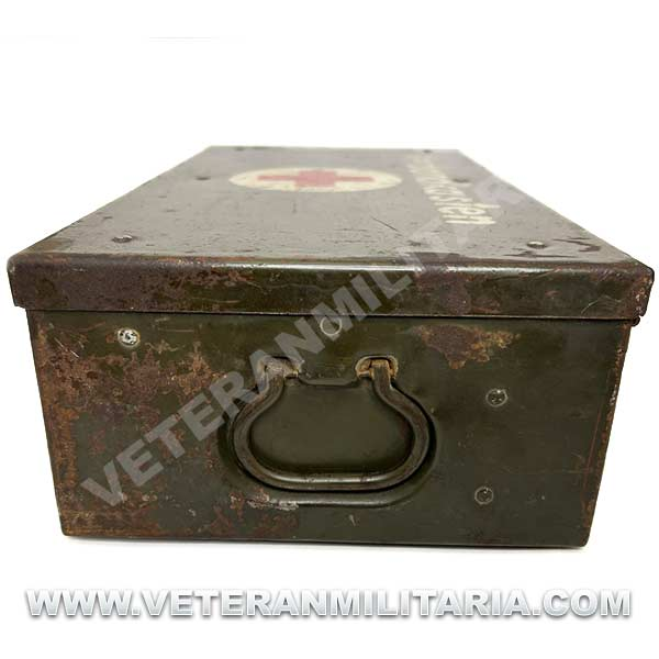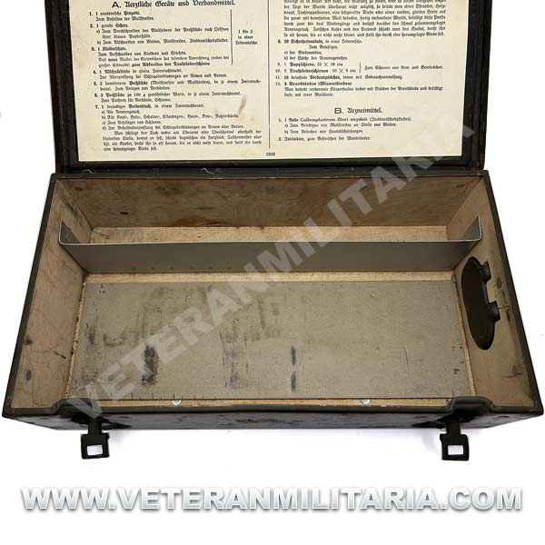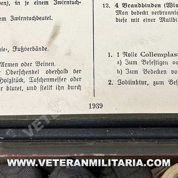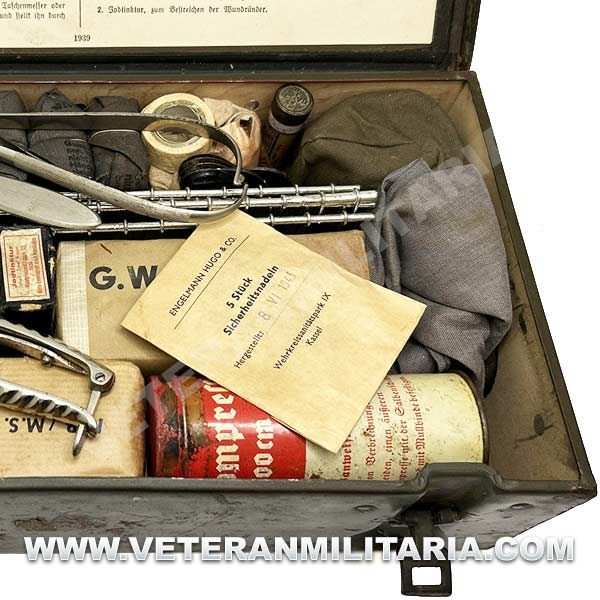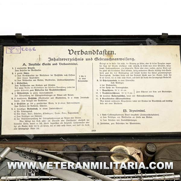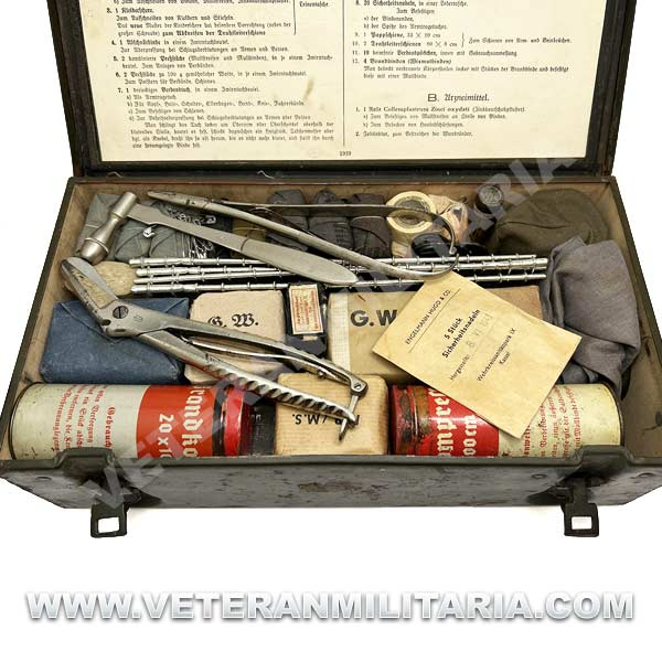 Botiquín de primeros auxilios “Verbandkasten” completo. Caja de metal, el exterior conserva la gran mayoría de su acabado y las letras a lo largo de la tapa frontal, en interior etiqueta de papel con información relativa al contenido, fechada 1939