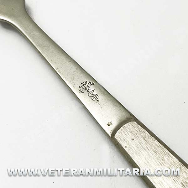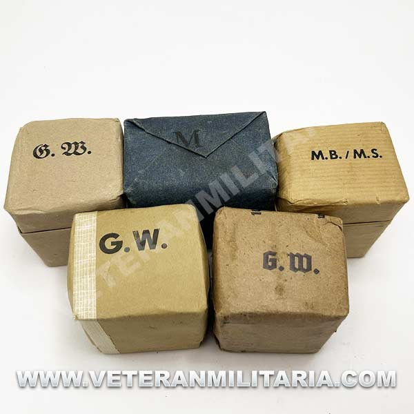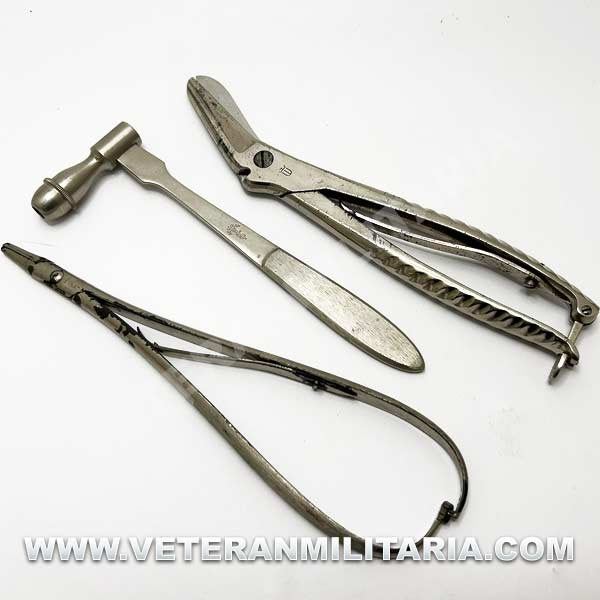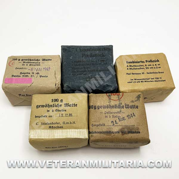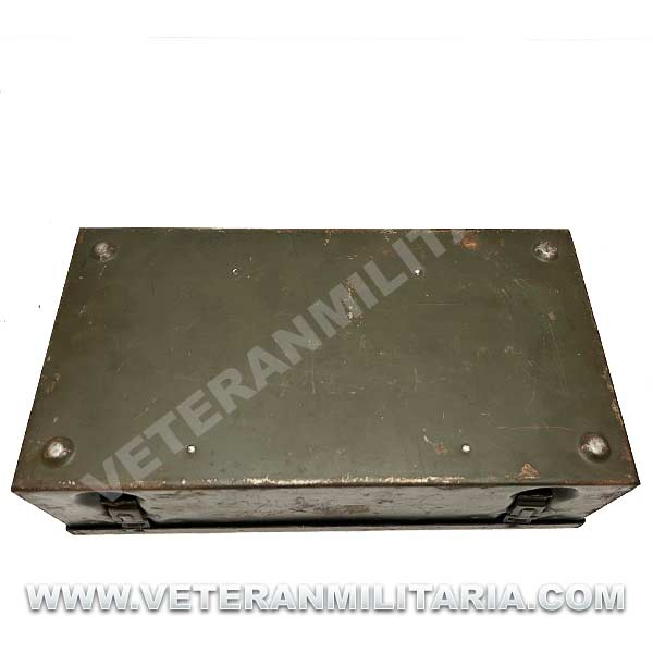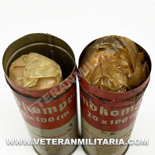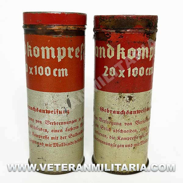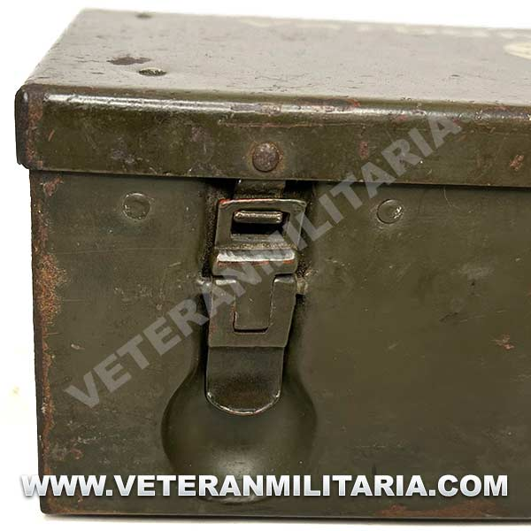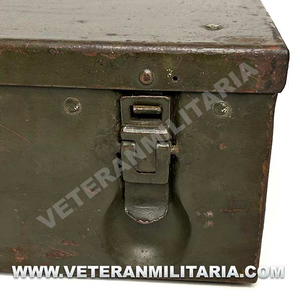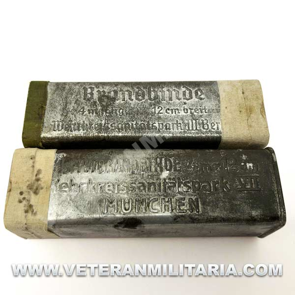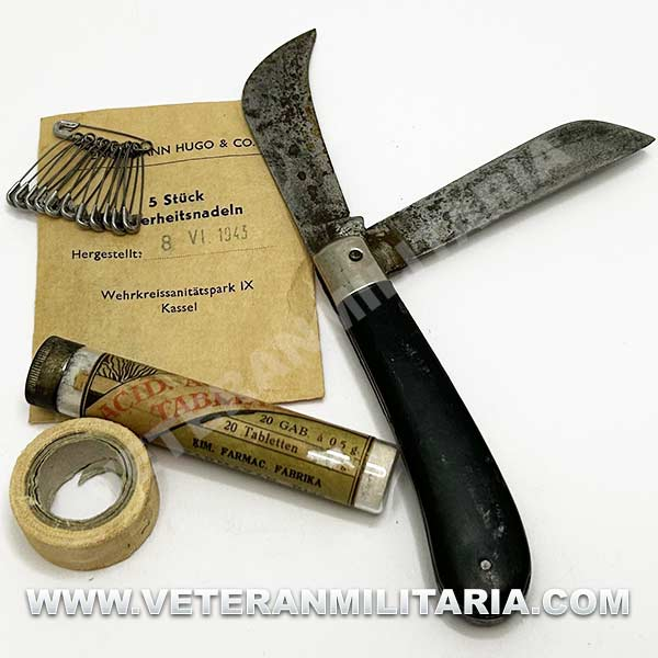 Botiquín de primeros auxilios “Verbandkasten” completo. Caja de metal, el exterior conserva la gran mayoría de su acabado y las letras a lo largo de la tapa frontal, en interior etiqueta de papel con información relativa al contenido, fechada 1939