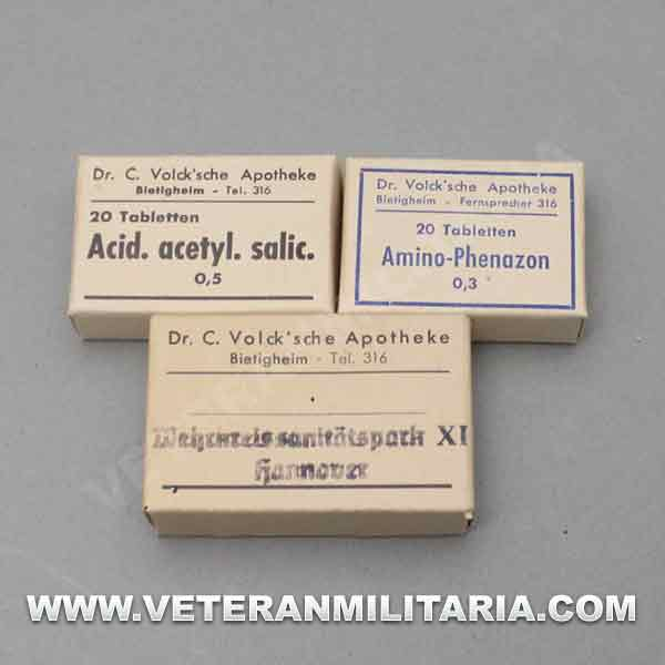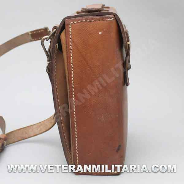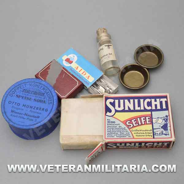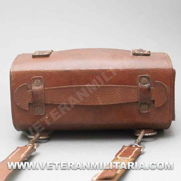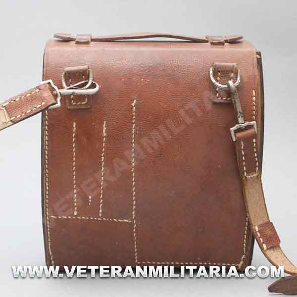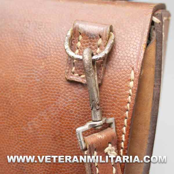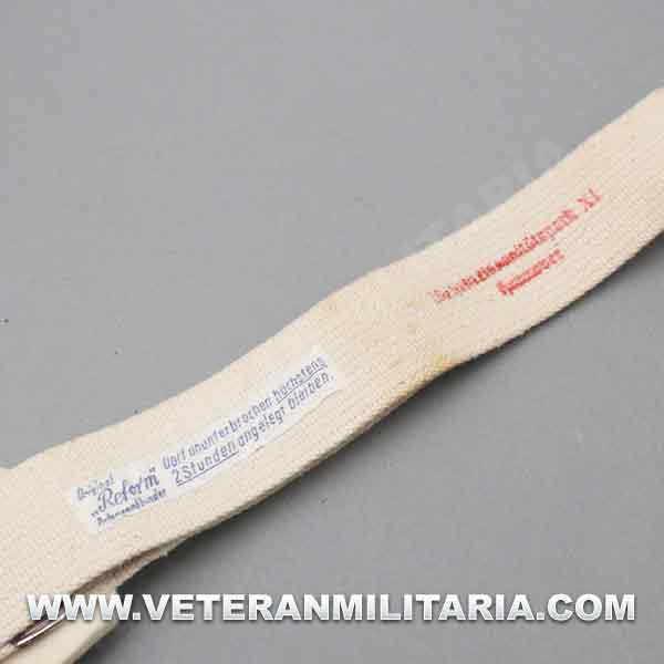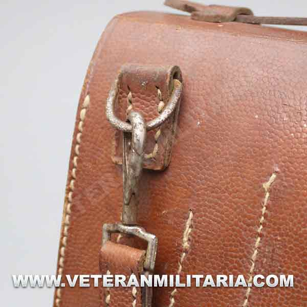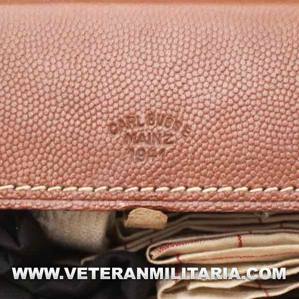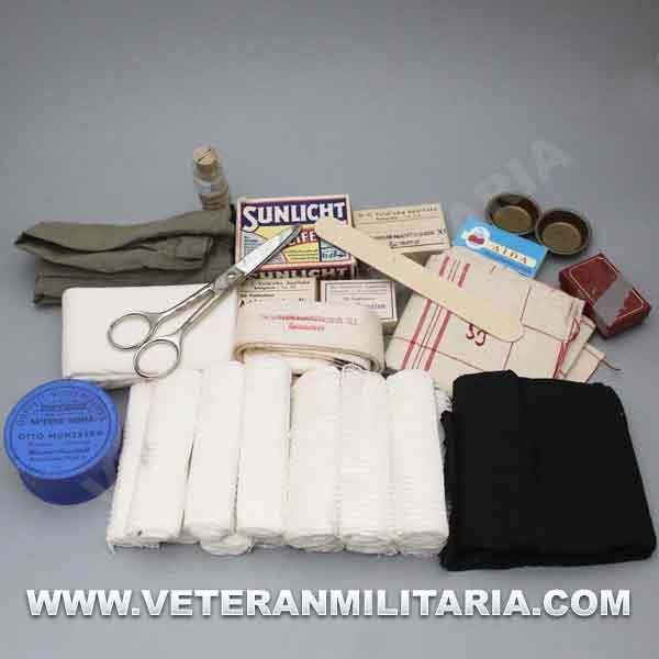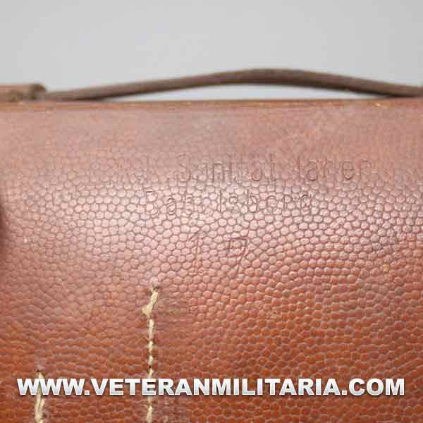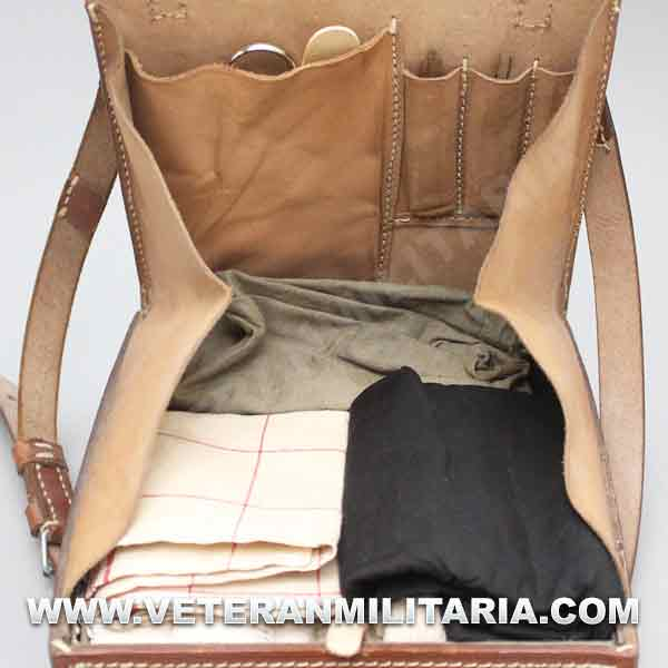 Botiquín alemán DRK (Deutsches Rotes Kreuz) de primeros auxilios, fabricado en cuero marrón con correa, marcajes de fabricante CARL BUSSE MAINZ 1941, contiene muchas vendas, torniquete, cabestrillo, tijeras, jabón, cajas algunas con contenido.
