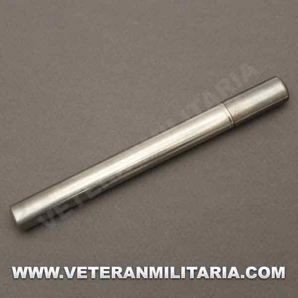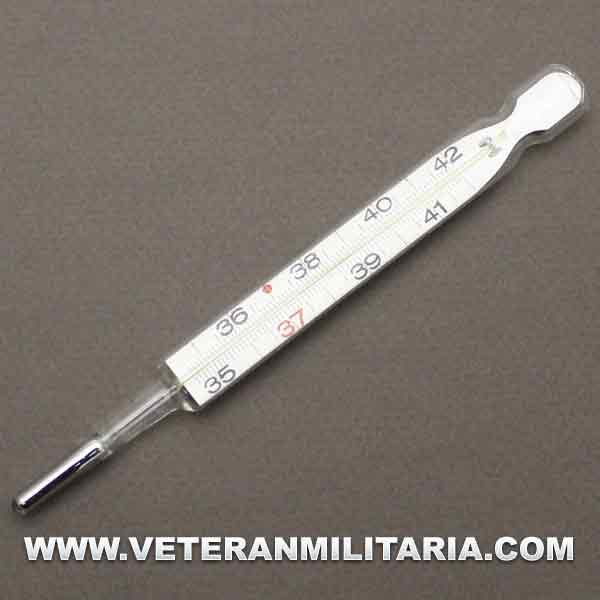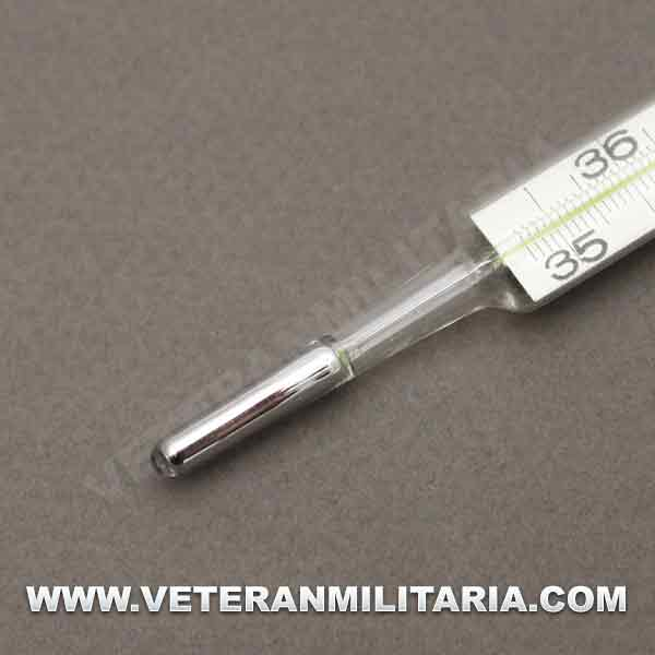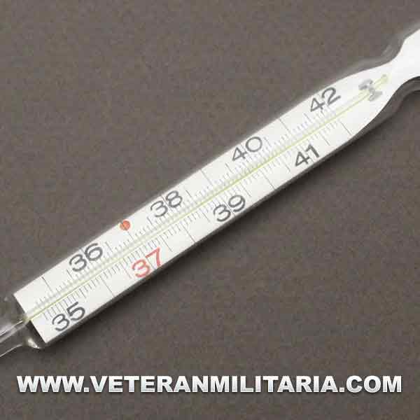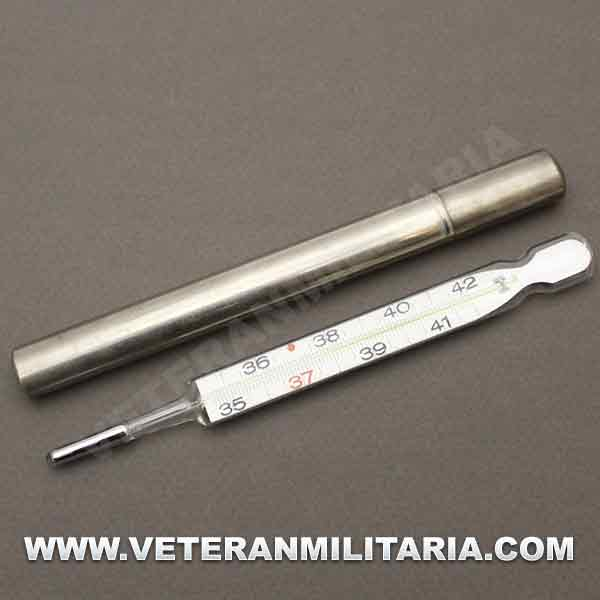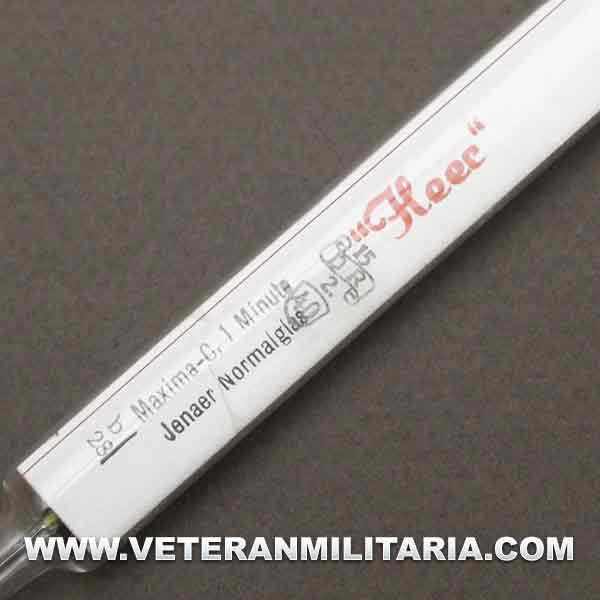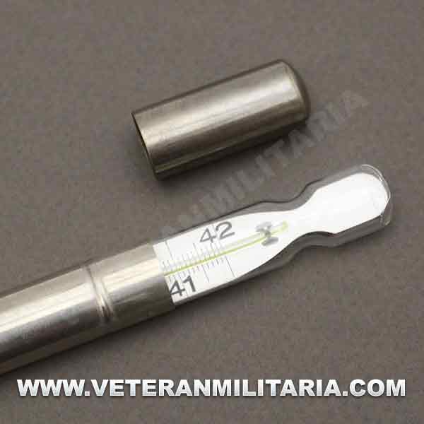Termómetro alemán HEER, fechado en 1940, con tubo metálico de transporte.