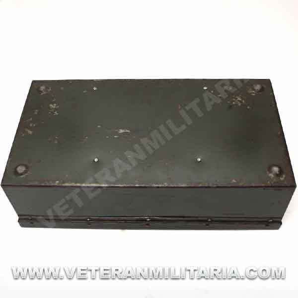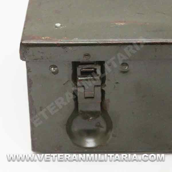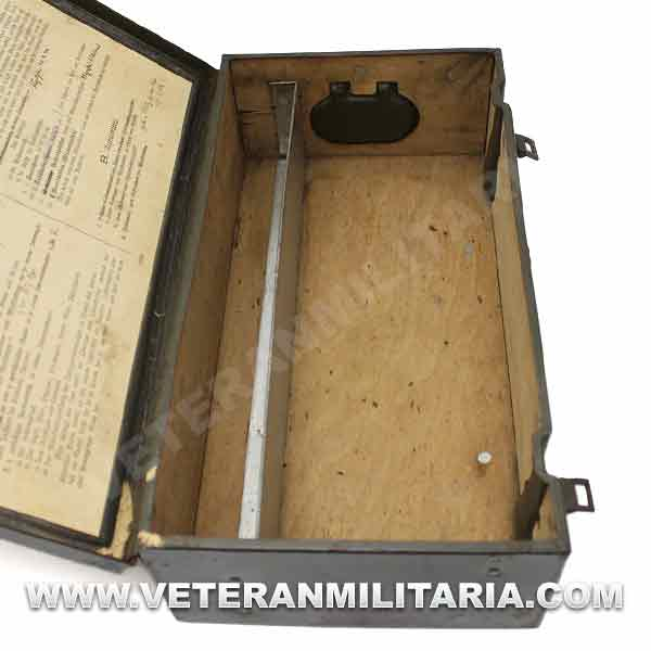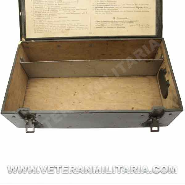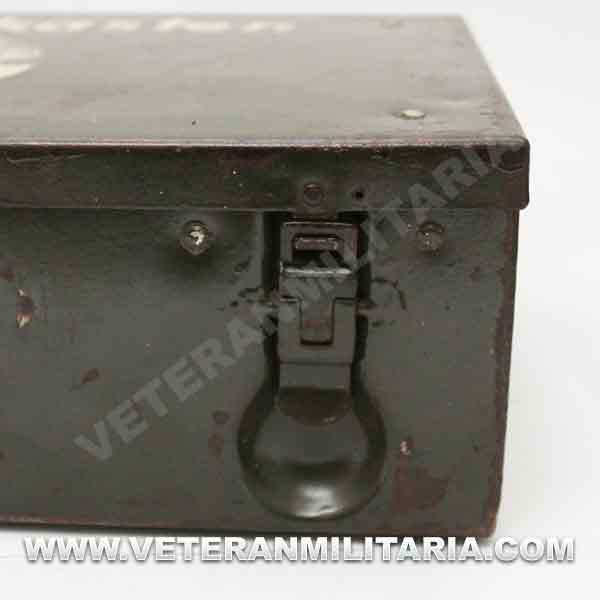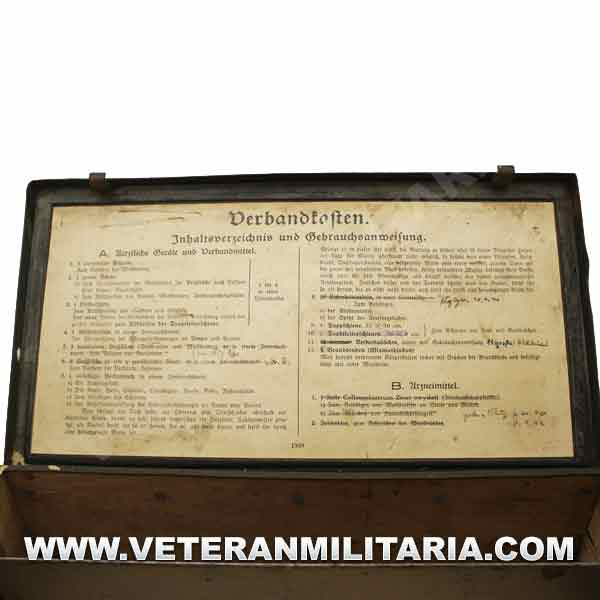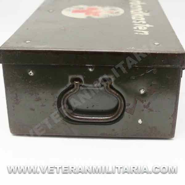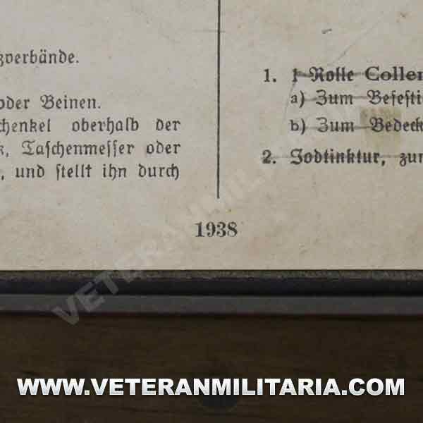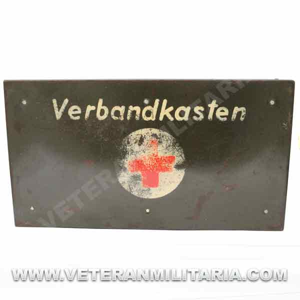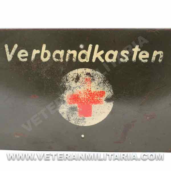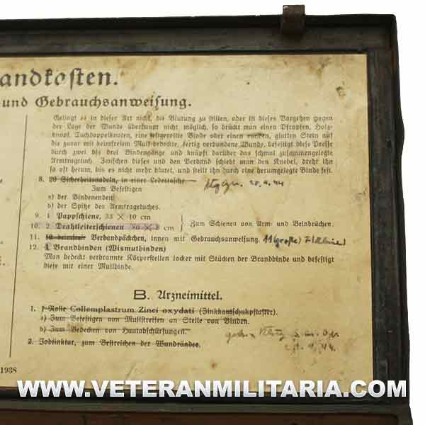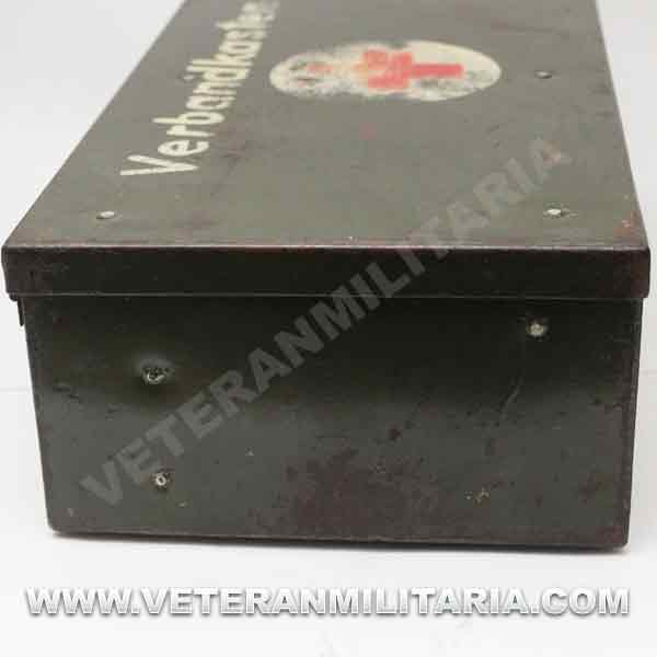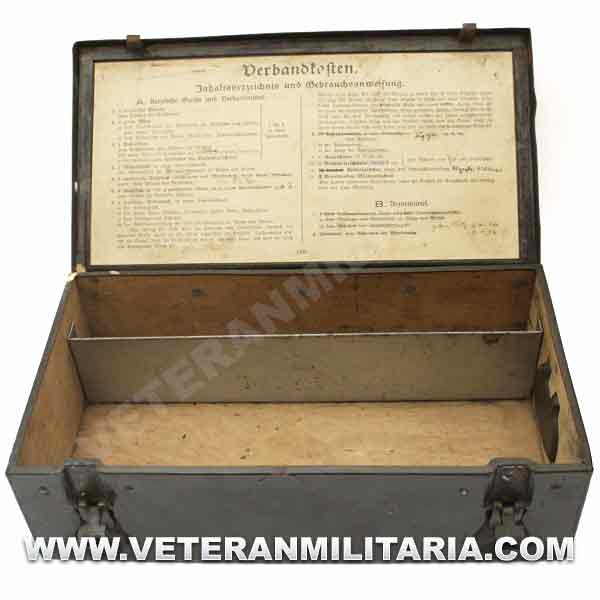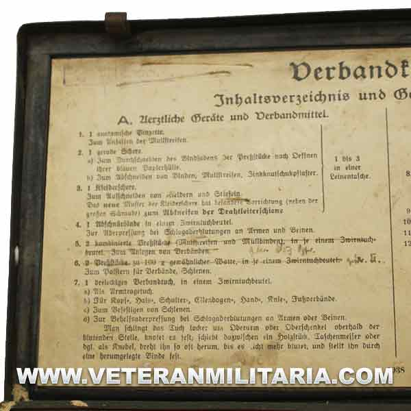 Botiquín alemán de primeros auxilios “Verbandkasten”, la caja esta vacía, caja de metal, el exterior conserva la gran mayoría de su acabado y las letras a lo largo de la tapa frontal, en interior etiqueta de papel con información relativa al contenido, fechada 1938.