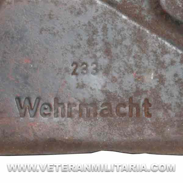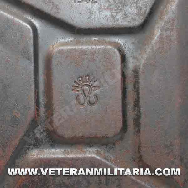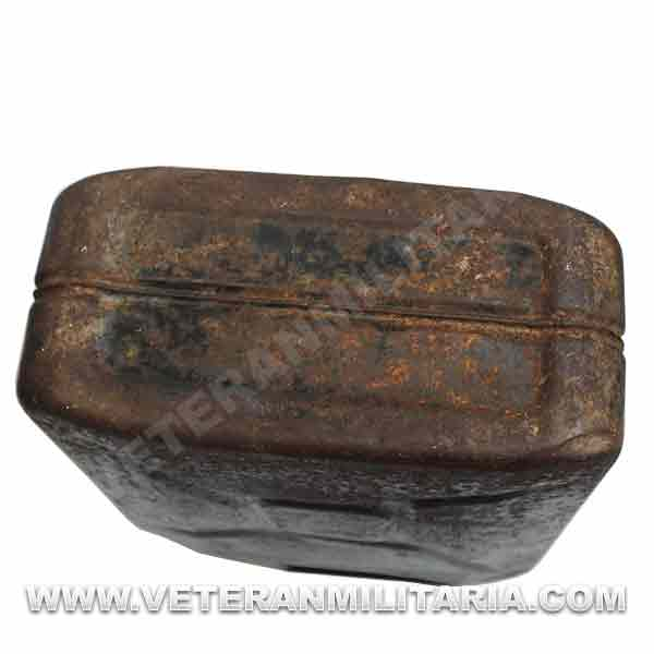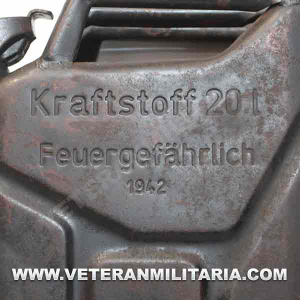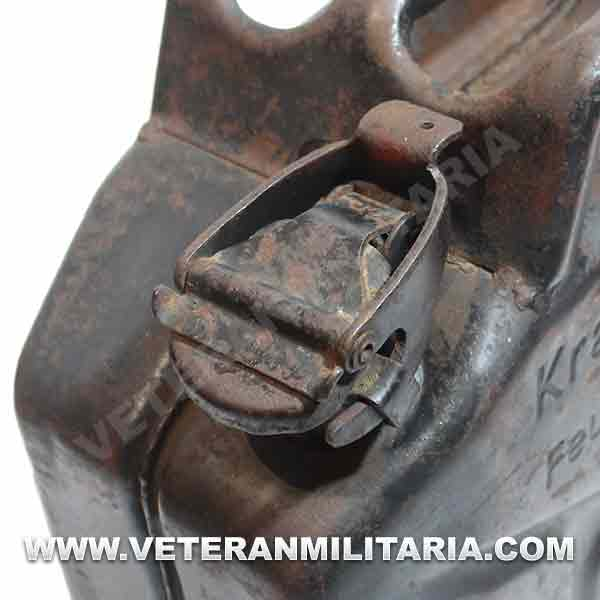 Bidón de gasolina de 20 L, marcajes Kraftstoff 20 L, Feuergefärlich 1942, fabricante Nirona y la designación Wehrmacht con el numero 233. Bidón conserva 60% de su pintura original.