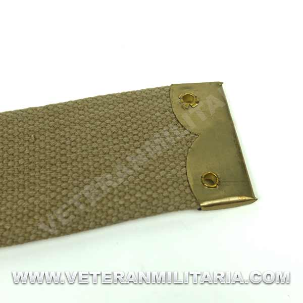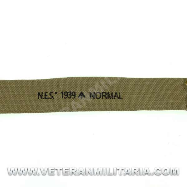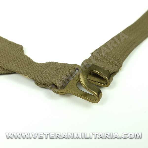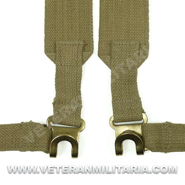 Reproducción de correas modelo 37 en L, fabricadas en algodón de color caqui, herrajes de latón, con marcajes de fabricante. Este tipo de correas son para utilizar con la mochila pequeña.