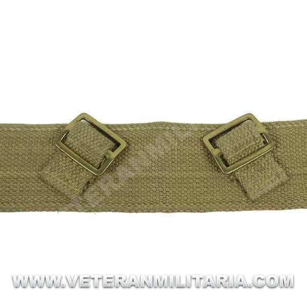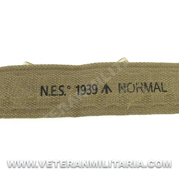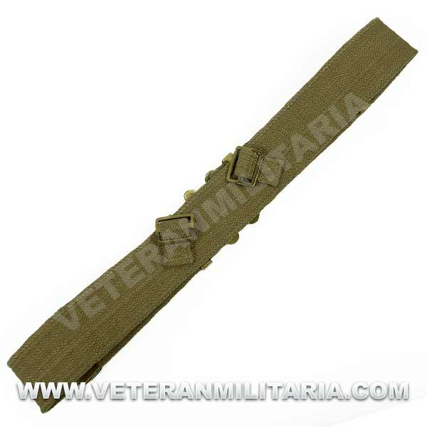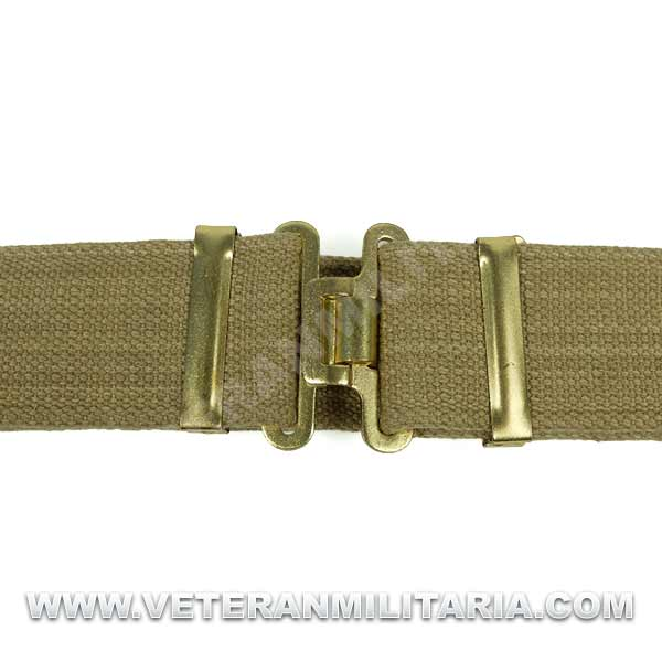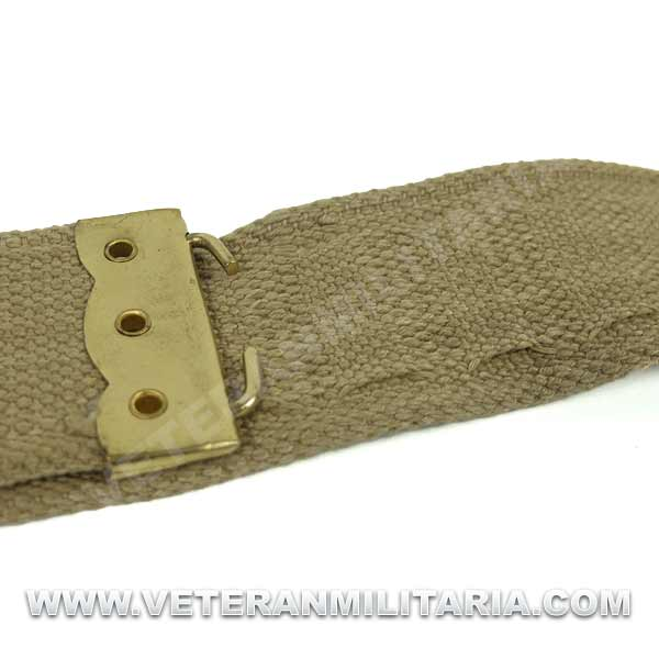 Reproducción de cinturón británico, fabricado en algodón de color caqui con herrajes de latón, con marcajes.