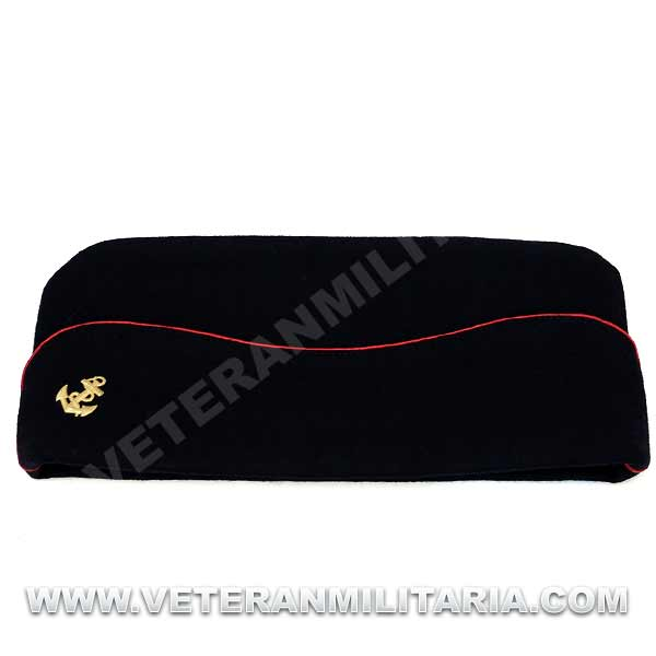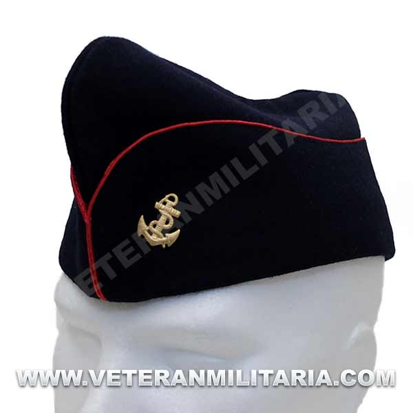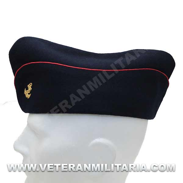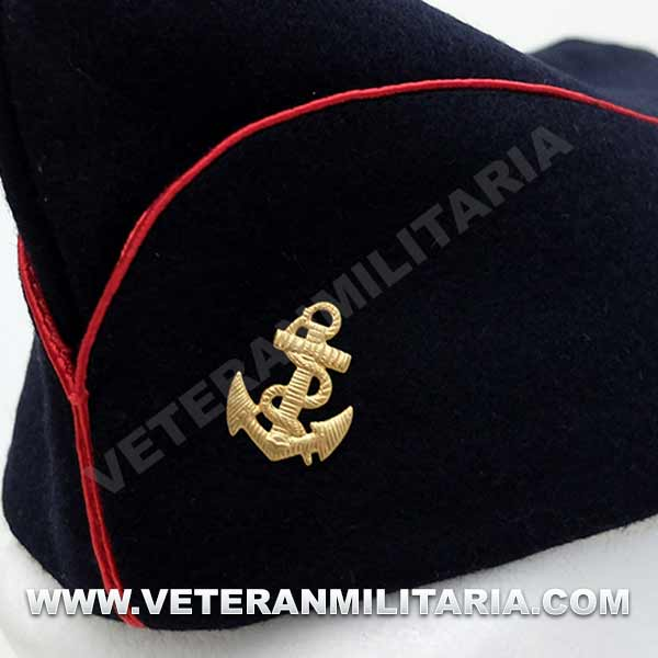 Calot francés de las Tropas de la infantería marina, utilizado por la novena compañía “La Nueve”. Fabricado en tela de color azul marino con ribete rojo, reproduccion exacta del ancla dorada, esta tipo de ancla fue utilizado en WW2.
