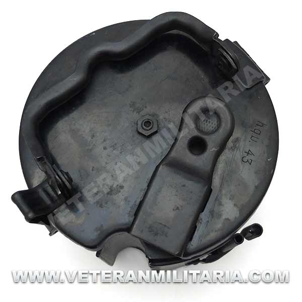 Cargador de tambor (Gurttrommel) para ametralladora alemana modelos MG34 y MG42, permite transportar en su interior una cinta de 50 cartuchos. Marcajes de fabricante h.q.u. 43 (Markes & Co., K.-G., Metallwarenfabrik u. Apparatebau, Luedenscheid)