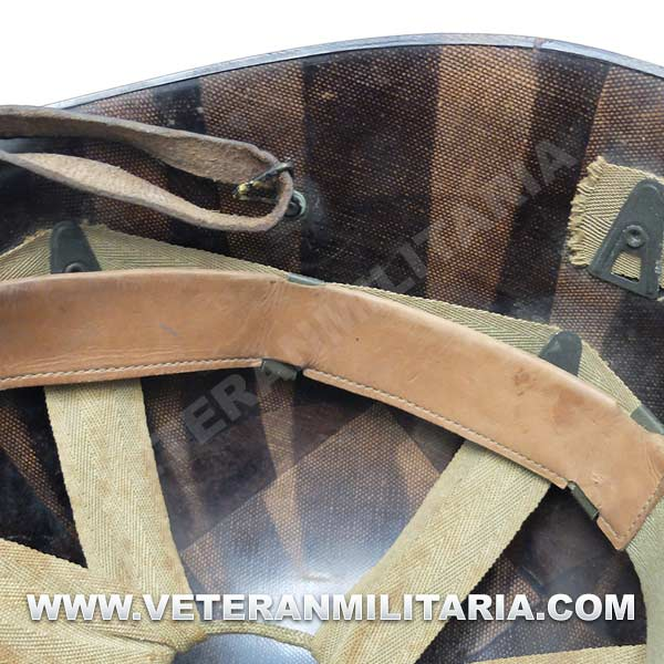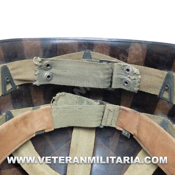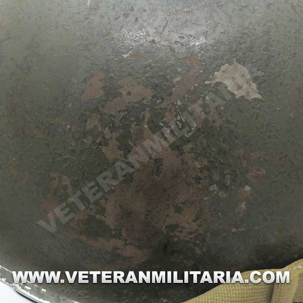 Casco M1 original, corte delantero, marcajes en la olla 944B, anillas oscilantes, la olla conserva mucha pintura original, el sotocasco de fibra con marcajes MSA (Mine Safety Appliances).