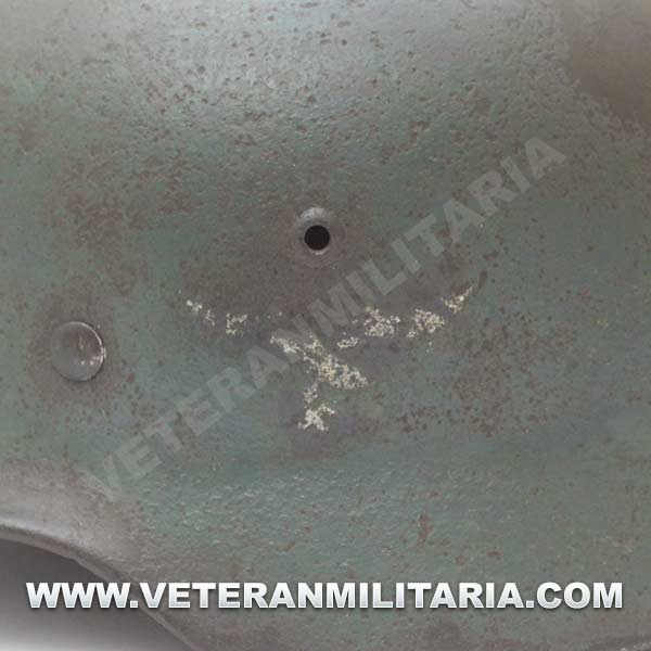 Casco de combate alemán M1935 con doble calca de Luftwaffe, la olla es original el interior es reproducción, conserva restos de la calca de Luftwaffe y restos de escudo, pintura camo original, se aprecia dos verdes en el casco, marcado Q66.